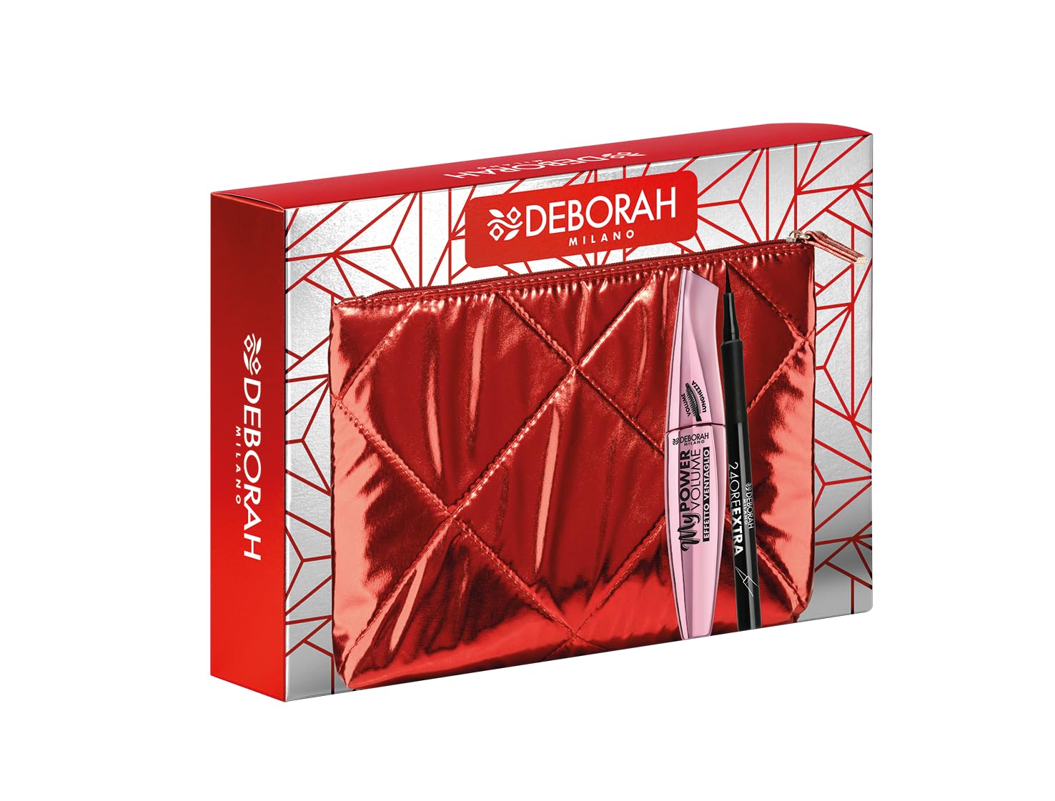 Packaging: Red padded pouch. Effect: Instantly volumizing and lengthening mascara for wild lashes eyeliner for a defined, full, and even line, creating a clear and intense makeup look. Contents: 1 MyPower Volume mascara, 1 extra black 24-hour eyeliner pen. Product: Gift set in a pouch N.06, with an eye makeup kit for an irresistible and captivating look. Discover Deborah Milano kits and gift sets to impress your loved ones on special occasions.