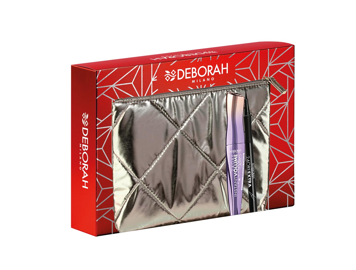 Packaging: Silver padded pouch. Effect: Instant volumizing and lengthening mascara for wild lashes eyeliner for a defined, full, and even line, creating a clear and intense makeup look. Contents: 1 Instant Up to the Stars mascara, 1 extra black 24-hour eyeliner pen. Product: Gift set in a pouch N.07, with an eye makeup kit for an irresistible and captivating look. Discover Deborah Milano kits and gift sets to impress your loved ones on special occasions.