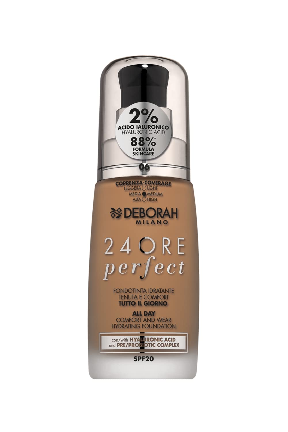 Deborah Milan has been an outstanding beauty for over 50 years. Made in Italy. Creativity, beauty, passion and love for detail are the core values. Liquid make-up, moisturizing with hyaluronic acid, long-lasting, hydrates, regenerates and restructures the skin, strengthens its natural defense forces. Contents: 1 x 24-hour Perfect Moisturizing Foundation. Contents: 30 ml. Color: N.6 Caramel SAFETY WARNING For external use only1 x perfect 24h moisturizing foundation, 30 ml, No. 1 Fair. Pat gently with a sponge or your hands. Moisturizing, regenerated, even and flawless skin. Formula with natural ingredients, ideal for sensitive and intolerant skin, enriched with organic aloe vera and vitamin C and with nourishing and antioxidant priorities. Moisturizing liquid foundation with hyaluronic acid, long-lasting, emphasizes the complexion by removing impurities, regenerates the skin and strengthens its natural defenses.Deborah Milano Vloeibare make-up, 24 uur perfect, hydraterend, SPF 20, N.6 Caramel, 30,0 ml, 1 Deborah Milaan is al meer dan 50 jaar een uitstekende schoonheid. Made in Italy. Creativiteit, schoonheid, passie en liefde voor detail zijn de kernwaarden. Vloeibare make-up, hydraterend met hyaluronzuur, langdurig, hydrateert, regenereert en herstructureert de huid, versterkt de natuurlijke afweerkrachten. Inhoud: 1 x 24-uurs Perfect Moisturizing Foundation. Inhoud: 30 ml. Kleur: N.6 Caramel VEILIGHEIDSWAARSCHUWING Alleen voor uitwendig gebruik1 x perfect 24h hydraterende foundation, 30 ml, nr. 1 Fair. Dep zachtjes met een spons of je handen. Hydraterende, geregenereerde, gelijkmatige en onberispelijke huid. Formule met natuurlijke ingrediënten, ideaal voor de gevoelige en intolerante huid, verrijkt met biologische aloë vera en vitamine C en met voedende en antioxiderende prioriteiten. Vochtinbrengende vloeibare foundation met hyaluronzuur, duurzaam, benadrukt de teint door het verwijderen van onzuiverheden, regenereert de huid en versterkt de natuurlijke afweer.