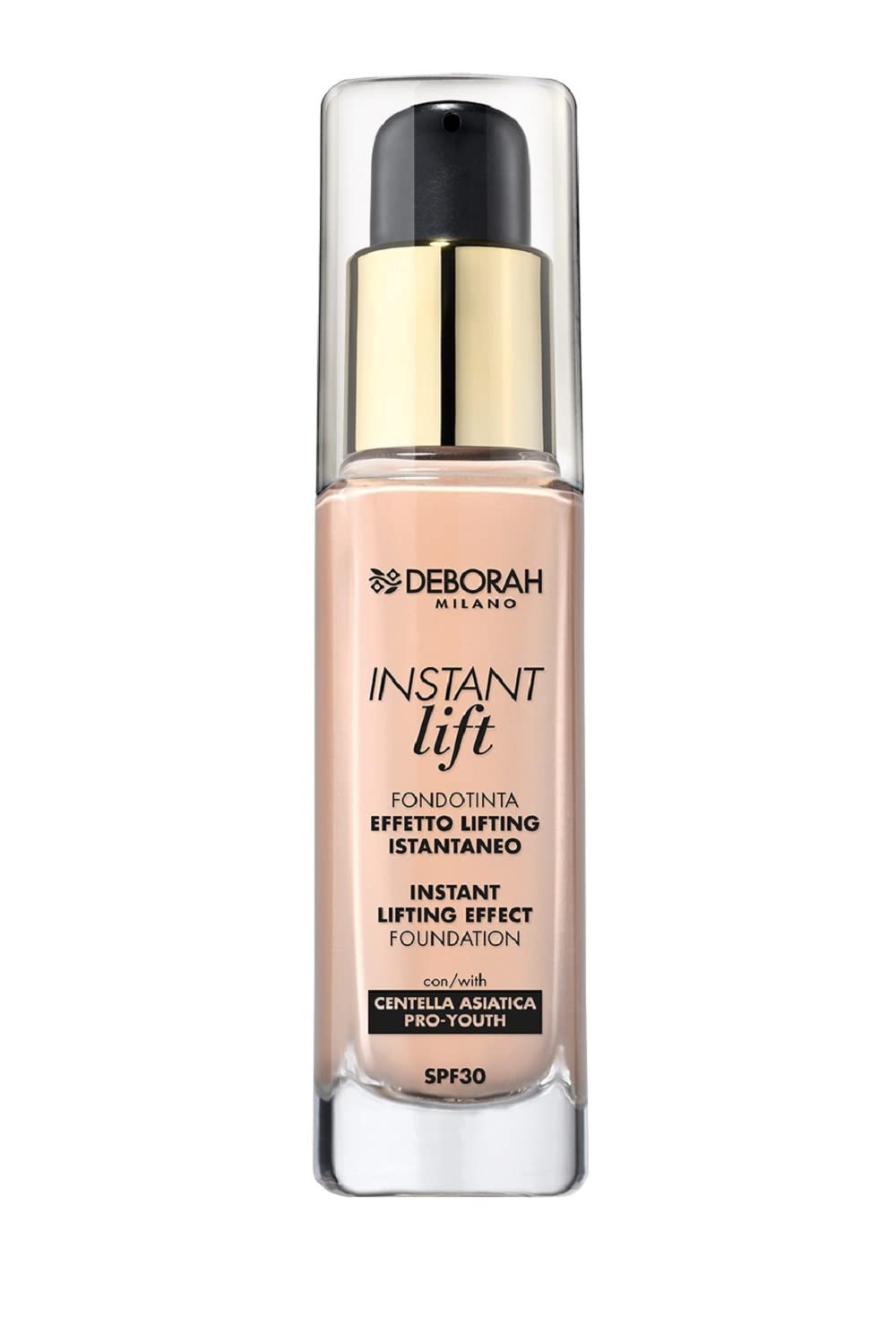 INSTRUCTIONS FOR USE Apply a few drops to the center of the forehead, cheeks, nose and chin and apply with a massage from the center outside the face, either with the hands or with a brush. If you are using a sponge, blot it and then spread it with your fingertips.Contents: 1x Instant Lift Foundation Contents: 30 ml. Colour: 0 Fair Rose. To use: Apply a few drops to the center of the forehead, cheeks, nose and chin and apply with a massage from the center outside the face, either with the hands or with a brush. If you are using a sponge, blot it and then spread it with your fingertips. Effect: Tight and elastic skin, naturally revitalized and radiant with visible results over time. Formula: light antioxidant formula with Centella Asiica, enriched with soft-focus powder for a radiant, smooth and even complexion. Product: Liquid foundation with direct lifting effect, enriched with Centella Asiica, to counteract signs of skin aging and give naturally radiant and smooth skin.Deborah Instant Lift Foundation nr. 0 Fair Rose SPF30, lange grip, lifting-effect, vloeibare en lichte textuur, met zacht focuspoeder voor onmiddellijke straling GEBRUIKSAANWIJZING Breng een paar druppels aan in het midden van het voorhoofd, wangen, neus en kin en breng aan met een massage vanuit het midden buiten het gezicht, hetzij met de handen of met een borstel. Als je een spons gebruikt, dep hem dan af en verdeel je hem dan met je vingertoppen.Inhoud: 1x Instant Lift Foundation Inhoud: 30 ml. Kleur: 0 Fair Rose. Gebruik: Breng een paar druppels aan in het midden van het voorhoofd, wangen, neus en kin en breng aan met een massage vanuit het midden buiten het gezicht, hetzij met de handen of met een borstel. Als je een spons gebruikt, dep hem dan af en verdeel je hem dan met je vingertoppen. Effect: strakke en elastische huid, natuurlijk gerevitaliseerd en stralend met zichtbare resultaten in de loop van de tijd. Formule: lichte antioxidatieve formule met Centella Asiica, verrijkt met soft-focuspoeder voor een stralende, gladde en gelijkmatige teint. Product: Vloeibare foundation met direct lifting-effect, verrijkt met Centella Asiica, om tekenen van huidveroudering tegen te gaan en een natuurlijk stralende en gladde huid te geven.
