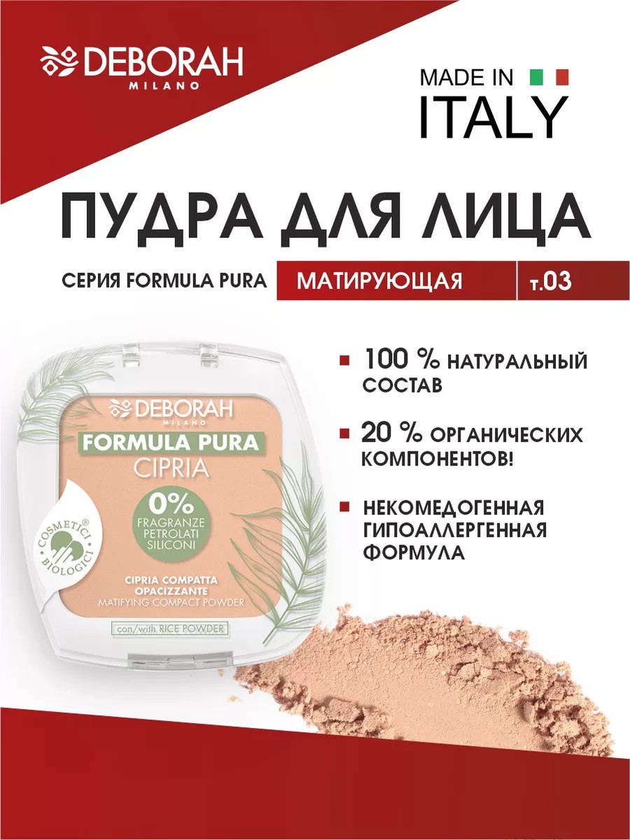 Применение: - нанесите ее на лицо при помощи кисти или пуховки и наслаждайтесь ровным и матовым покрытием на протяжении всего дня. С Дебора матовой пудрой для лица ваша кожа будет выглядеть свежей и здоровой, без лишнего блеска и несовершенств. Итальянская декоративная косметика для всех типов кожи, комби, жирной или сухой. Итальянская декоративная косметика для всех типов кожи, комби, жирной или сухой.