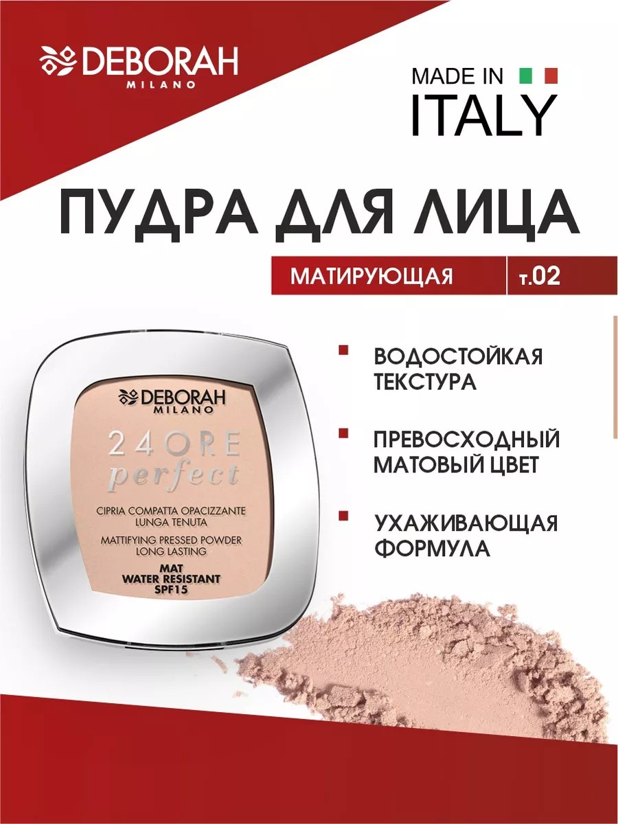 Deborah Milano Пудра для лица матирующая стойкая 24Ore Perfect, тон 02 light rose / светлый розовый.