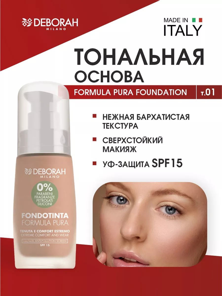 Дебора тональная основа, которая предлагает безупречное, комфортное и безопасное покрытие для вашего макияжа. Этот продукт идеально подходит для обладательниц чувствительной кожи, поскольку он не содержит парабены, силиконы, продукты нефтепереработки, акрилаты и ароматизаторы.