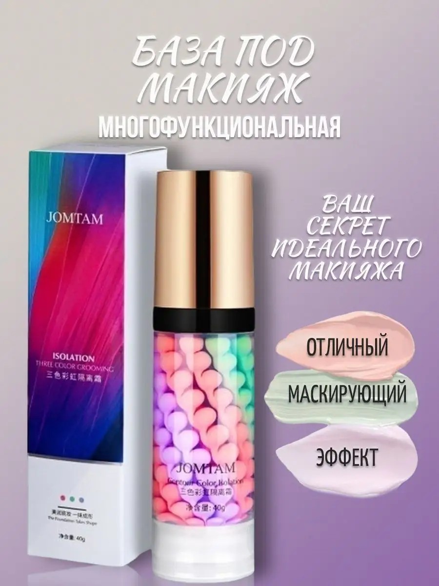 База под макияж многофункциональная, трехцветная. Средство в 3 в 1, состав которого гармонично взаимодействует и позволяет добиться идеально-нежной, бархатной кожи без видимых следов маскирующего средства, Праймер - база под макияж выравнивает тон, улучшает структуру и рельеф кожи. Трёхцветная выравнивающая основа под макияж имеет три тонирующих цвета, которые идеально скрывают все недостатки по тону и текстуре кожи. Основа под макияж одновременно выравнивает тон, улучшает структуру и рельеф кожи. Работает как корректор, после него вы наносите тональный крем и косметику ещё экономичнее. Нормализует работу сальных желез, увлажняет, придает ровный рельеф коже и скрывает поры. Трёхцветный праймер для лица 3в1 отлично подойдёт для лета, так как имеет легкую кремообразную консистенцию. Основа для макияжа состоит из трёх цветов, которые при нанесении смешиваются и работают по всему лицу. Фиолетовый - убирает желтизну лица. Зелёный - нейтрализует красноту, воспаления и раздражения Розовый - скрывает неровности кожи даёт мягкий ровный тон.