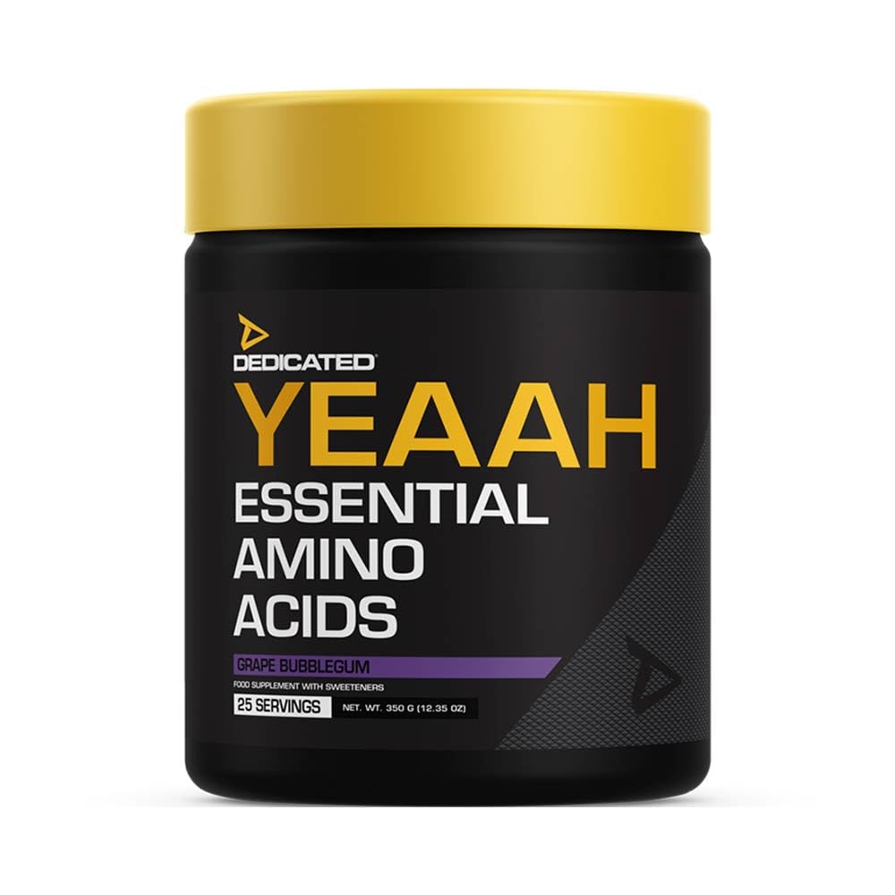 YEAAH Amino from Dedicated Nutrition is the ultimate product for your training! YEAAH AMINO DEDICATED NUTRITION PROPERTIES: YEAAH Amino contains the absolute highest clinically proven doses of BCAAs and essential amino acids. When was the last time you said YEAAH at the gym? With YEAAH Amino this is now possible again! YEAAH AMINO DEDICATED NUTRITION FEATURES: 25servings Contains important Amino Acids Delicious, fresh taste 2400mg L-Leucine 1600mg L-Citrulline 1600mg Taurine 1200mg L-Isoleucine 1200mg L-Valine INGREDIENTS Per serving: 14 g Calcium 22 mg, Phosphorus 15 mg, Magnesium 9 mg, Sodium 5 mg, Potassium 30 mg, L-leucine 2400 mg, L-citrulline 1600 mg, Taurine 1600 mg, L-isoleucine 1200 mg, L-valine 1200 mg, L-lysine HCL 800 mg, L-phenylalanine 800 mg, L-threonine 800 mg, L-histidine HCL 400 mg, Sodium gluconate 240 mg, Calcium glycerophosphate 120 mg, Potassium glycerophosphate 120 mg, L-methionine 60 mg, Magnesium citrate 60 mg, Astragin (panax notoginseng astragalus membranaceous) 50 mg, L-tryptophan 40 mg Calcium 22 mg, Phosphorus 15 mg, Magnesium 9 mg, Sodium 5 mg, Potassium 30 mg, L-leucine 2400 mg, L-citrulline 1600 mg, Taurine 1600 mg, L-isoleucine 1200 mg, L-valine 1200 mg, L-lysine HCL 800 mg, L-phenylalanine 800 mg, L-threonine 800 mg, L-histidine HCL 400 mg, Sodium gluconate 240 mg, Calcium glycerophosphate 120 mg, Potassium glycerophosphate 120 mg, L-methionine 60 mg, Magnesium citrate 60 mg, Astragin (panax notoginseng astragalus membranaceous) 50 mg, L-tryptophan 40 mg INSTRUCTIONS FOR USE Mix 1-2 scoop(s) (14-28 g) with 200-400 ml cold water. Take before and during training on training days. SAFETY WARNING A nutritional supplement is not a substitute for a varied diet. This supplement is not suitable for persons under the age of 18. Do not exceed recommended daily dosage. Consult your physician before use if you are taking prescribed or over-the-counter medications and or dietary supplement(s). Do not use if you are pregnant or breastfeeding. See moreYEAAH Amino from Dedicated Nutrition is the ultimate product for your training! 25servings Contains important Amino Acids Delicious, fresh taste.YEAAH Amino 350gr Grape Bubblegum YEAAH Amino van Dedicated Nutrition is het ultieme product voor rond jouw training! YEAAH AMINO DEDICATED NUTRITION EIGENSCHAPPEN: YEAAH Amino bevat de absoluut hoogste klinisch bewezen doseringen van BCAA's en essentiële aminozuren. Wanneer zei je voor het laatst YEAAH in de sportschool? Met YEAAH Amino kan dat nu weer! YEAAH AMINO DEDICATED NUTRITION KENMERKEN: 25servings Bevat belangrijke Aminozuren Heerlijk, frisse smaak 2400mg L-Leucine 1600 mg L-citrulline 1600 mg Taurine 1200mg L-Isoleucine 1200mg L-Valine INGREDIËNTEN Per serving: 14 g Calcium 22 mg, Fosfor 15 mg, Magnesium 9 mg, Natrium 5 mg, Kalium 30 mg, L-leucine 2400 mg, L-citrulline 1600 mg, Taurine 1600 mg, L-isoleucine 1200 mg, L-valine 1200 mg, L-lysine HCL 800 mg, L-fenylalanine 800 mg, L-threonine 800 mg, L-histidine HCL 400 mg, Natriumgluconaat 240 mg, Calciumglycerofosfaat 120 mg, Kaliumglycerofosfaat 120 mg, L-methionine 60 mg, Magnesiumcitraat 60 mg, Astragin (panax notoginseng astragalus membranaceous) 50 mg, L-tryptofaan 40 mg Calcium 22 mg, Fosfor 15 mg, Magnesium 9 mg, Natrium 5 mg, Kalium 30 mg, L-leucine 2400 mg, L-citrulline 1600 mg, Taurine 1600 mg, L-isoleucine 1200 mg, L-valine 1200 mg, L-lysine HCL 800 mg, L-fenylalanine 800 mg, L-threonine 800 mg, L-histidine HCL 400 mg, Natriumgluconaat 240 mg, Calciumglycerofosfaat 120 mg, Kaliumglycerofosfaat 120 mg, L-methionine 60 mg, Magnesiumcitraat 60 mg, Astragin (panax notoginseng astragalus membranaceous) 50 mg, L-tryptofaan 40 mg GEBRUIKSAANWIJZING Meng 1-2 maatschep(pen) (14-28 g) met 200-400 ml koud water. Neem op trainingsdagen voor en tijdens een training. VEILIGHEIDSWAARSCHUWING Een voedingssupplement is geen vervanging voor een gevarieerde voeding. Dit supplement is niet geschikt voor personen beneden de 18 jaar. Aanbevolen dagdosering niet overschrijden. Raadpleeg voor gebruik uw arts als u voorgeschreven of vrij verkrijgbare medicatie en of voedingssupplement(en) gebruikt. Niet gebruiken als u zwanger bent of borstvoeding geeft. Meer bekijkenYEAAH Amino van Dedicated Nutrition is het ultieme product voor rond jouw training! 25servings Bevat belangrijke Aminozuren Heerlijk, frisse smaak.