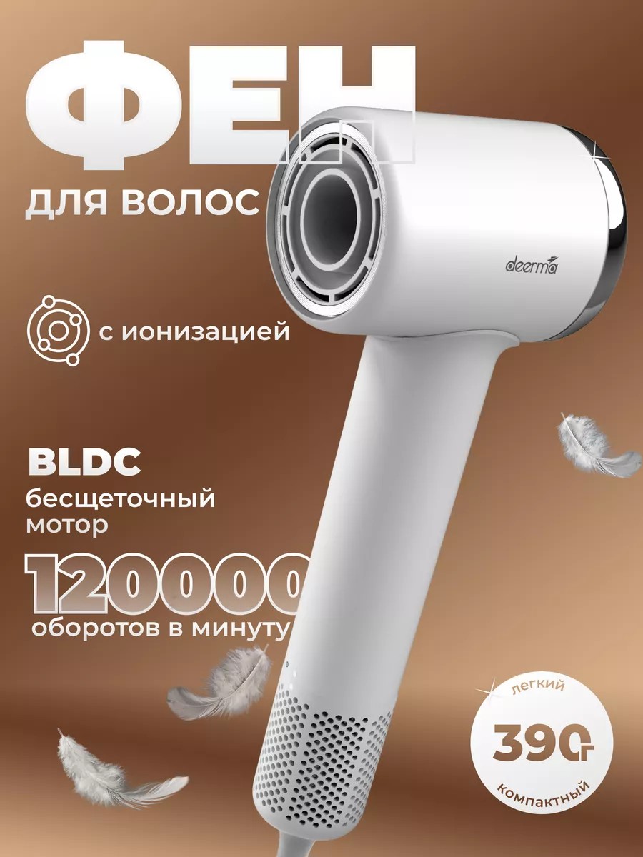 Даже густые идлинные волосы можно высушить засчитанные минуты, если купить фен Deerma Hair Dryer DEM-CF50W. Благодаря инновационному бесщеточному двигателю (BLDC мотор , 120000об/мин.) с цифровым управлением фен создает мощный сфокусированный поток воздуха для бережной сушки и укладки волос. BLDC мотор дает возможность настроить исходящий поток воздуха по температуре и скорости, гарантирует стабильность этих показателей независимо от продолжительности беспрерывной работы фена. Если другие фены с DC и AC мотором повреждают волосы, фен Deerma CF50W делает ихухоженными без риска. Все благодаря с инновационному двигателю (BLDC), 13-лопастной турбине иумному контролю температуры NTC, атакже функции ионизации. Вместо пересушенных волос ссекущимися кончиками выполучаете идеально гладкие иблестящие пряди.