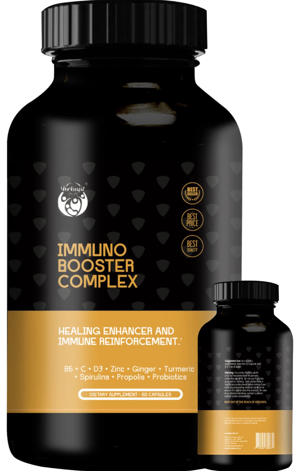 Vitamin C, B6, D3, Zinc, Echinacea, Ginger, Turmeric, Spirulina, Bee Propolis Lactobacillus Acidophilus. YOUR GO-TO IMMUNE SOLUTION - If you're looking for a super supplement that provides healthy immune system support the added benefits of nourishing essential vitamins, give yourself your family Yerbafit all-natural 10-in-1 immune system booster Supplements with Vitamin C [850mg] Vitamin B6 [1.7mg], Vitamin D3 [100mcg], Zinc [120mg], Echinacea [150mg], Ginger Extract [120mg], Organic Turmeric Powder [75mg], Organic Spirulina [50mg], Bee Propolis powder [50mg], Lactobacillus acidophilus[5mg]. FAST-ABSORBING IMMUNE SUPPORT BLEND – Yerbafit vitamins for immune system support supplements contain Spirulina which means all 10 nutritional ingredients go to work fast, supporting your body from head to toe. Enjoy all the benefits of the best immune-supporting ingredients without the downsides of drinking nasty liquids and popping sugary gummies. With just two capsules daily, our powerful antioxidant formula can help keep your immune system healthy. 10 POTENT IMMUNITY INGREDIENTS - Yerbafit exclusive blend for fast and powerful support includes: vitamins B6, C, D3, and Zinc, as well as Echinacea, Ginger Extract, Organic Turmeric, Spirulina, and Bee propolis with Lactobacillus acidophilus. This blend of vitamins, minerals, powders, and probiotics is designed to support cardiovascular, brain, digestive, and immune health. Each capsule supports vision and skin care, and weight management helps maintain joint and muscle health and flexibility. EFFECTIVE-IMMUNE-BOOSTER-SUPPLEMENT-YERBAFIT-IMMUNE-BOOSTERS-for-Adults-are-the-most-convenient-way-to-achieve-Immune-Health,Increased-Energy,Reduced-Fussiness,Digestive-Health.Our-Multivitamin-Capsules-make-it-even-easier-to-stay-Healthy-all-year-long-and-feel-better-every-day.The-unique-formula-of-immune-support-VITAMINS-will-not-only-boost-your-IMMUNE-SYSTEM-but-also-improve-your-skin-Health-HELP-inflammation-levels.