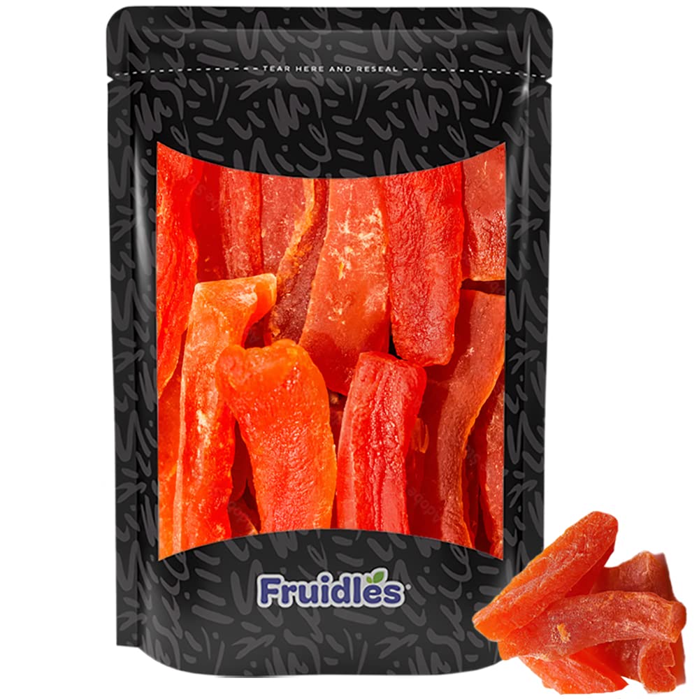Dehydrated Papaya Spears, NON-GMO Orange Sweet, And Chewy Dried Papaya Spears are a healthy choice for a snack. These Not Too Hard And Not Too Sticky Papaya Spears are made from fresh papaya fruit grown in many tropical areas. The spears are thin strips of fresh papaya that have been heated to remove moisture. This process increases its shelf life exponentially. These dried papaya spears fruit are a great way to satisfy a sweet craving while providing the body with an energizing source of nutrients. INGREDIENTS: Papaya, Sugar, Yellow #5, Sodium Metabisulfite As Sulphur Dioxide For Color Retention. Allergy Information: Made on Shared Equipment & May Contain: Milk, Peanuts, Tree Nuts, Wheat, Soy, Sesame & Egg. BUY RISK-FREE: At Fruidles, We fully stand behind our products with total satisfaction and a 100% money-back guarantee. Not satisfied with the Dehydrated Papaya Spears? We’ll send you a quick replacement or issue a full refund. Click ‘Add to Cart’ now to surprise your little one completely risk-free!