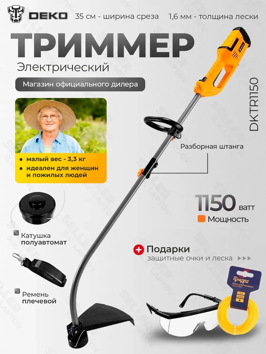 Триммер электрический садовый для травы DEKO DKTR1150 компактная модель, удобная для скашивания травы в труднодоступных местах, вдоль заборов, клумб, подравнивания газонов, краев садовых дорожек, а также для уборки сухостоя и густой травы. Особености: благодаря плечевому ремню (входит в комплект поставки), обеспечивается удобство работы. Дополнительная рукоятка обеспечивает устойчивость оператора и безопасную эксплуатацию. Разборная штанга для удобного и компактного хранения. Удобное расположение отсекателя режущей лески на защитном кожухе обеспечивает комфорт в процессе работы. Снимите защитную накладку с отсекателя перед началом работы и вам не придется каждый раз проверять длину лески. Она будет обрезаться самостоятельно. Триммер садовый электрический не выделяет вредных для человека и окружающей среды выхлопов, что делает использование инструмента безопасным для экологии. Технические характеристики: Напряжение: 220 В. Частота: 50 Гц. Мощность: 1150 Вт. Скорость холостого хода: 7500 об/мин. Ширина скашивания (леска): 350 мм. Диаметр лески: 1,6 мм. Сечение лески: Круглое. DEKO - глобальный поставщик инструментов. Фирменные продукты отличаются прочностью, мощностью, высокой точностью и надежностью. Бренд с отличной репутацией за эргономичный дизайн продуктов, строгий контроль качества и улучшенное обслуживание. Гарантия 1 год. Более 50 сервисных центров по России. При покупке триммера DEKO вы получаете моток лески 15 м и защитные очки в ПОДАРОК!