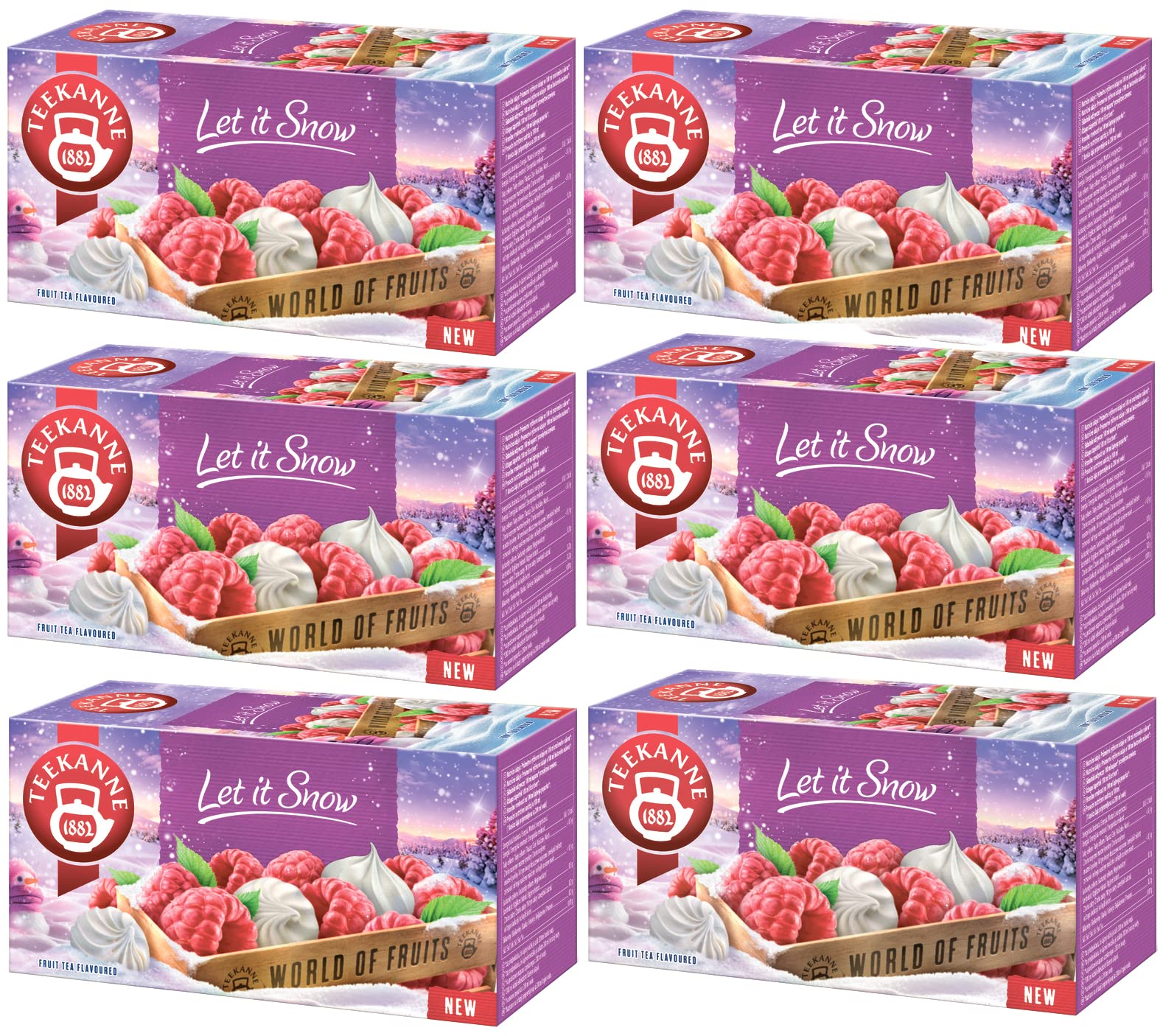 Let it Snow Teapot - Fruit Tea with Meringue and Raspberry Flavor. When winter darkness falls outside, there's no better companion than a warm, aromatic cup of tea. For such moments, the teapot has developed a fragrant blend with a particularly festive taste. Whether hot or cold, this tea is the perfect refresher for the whole family. Enjoy the festive season with the Let it Snow fruit-infused teapot with meringue and raspberry flavor. This delicious fruit infusion combines the sweetness of meringue with the fruity freshness of raspberries. Each cup is like a little taste sensation that will delight your senses and give you a pleasant feeling of comfort. The Let it Snow fruit-flavored teapot is not only a treat for the palate but also for the eyes. The tea leaves are beautifully decorated with small pieces of meringue and dried raspberries, giving the tea a festive touch and making it a real eye-catcher. Contents: 20 tea bags of 2.5 g each. Preparation: Pour freshly boiled water over the tea bag and let it steep for 8 minutes. We recommend one tea bag per cup. Add sugar to taste. INGREDIENTS Ginger and Lemon: Ginger (24 ), Apple (13 ), Lemongrass (11 ), Lemon Verbena (11 ), Lemon Flavoring (10 ), Licorice, Orange Peel, Lemon Peel (6 ), Chicory Root, Ginger Flavoring, Acidity Regulator: Citric Acid. INSTRUCTIONS Pour freshly boiled water over the tea bag and let it steep for 8 minutes. We recommend one tea bag per cup. SAFETY WARNING May contain traces of allergens. See moreTeekanne - Let it Snow- Meringue et Framboise Thé aux fruits (6 x 45 g)DESCRIPTION DU PRODUIT DESCRIPTION DU PRODUIT Théière Let it Snow Thé aux fruits au goût meringue et framboise. Lorsque l'obscurité hivernale tombe à l'extérieur, il n'y a pas de meilleur compagnon qu'une tasse de thé aromatique et chaud. La théière a développé pour de tels moments un mélange parfumé qui a un goût particulièrement festif. Que ce soit chaud ou froid, ce thé est le désaltérant idéal pour toute la famille. Profitez de la saison festive avec la théière Let it Snow infusé aux fruits aromatisés au goût meringue et framboise. Cette délicieuse infusion aux fruits combine la douceur de la meringue avec la fraîcheur fruitée des framboises. Chaque tasse est comme une petite merveille gustative qui ravira vos sens et vous donne une agréable sensation de confort. La théière Let it Snow aromatisée aux fruits n'est pas seulement un plaisir pour le palais, mais aussi pour les yeux. Les feuilles de thé sont joliment décorées de petits morceaux de meringue et de framboises séchées, ce qui donne au thé une touche festive et en fait un véritable accroche-regard. Contenu : 20 sachets de thé de 2,5 g. Préparation : versez le sachet de thé avec de l'eau fraîchement bouillie et laissez infuser pendant 8 minutes. Nous vous recommandons un sachet de thé par tasse. Ajoutez du sucre au goût. INGRÉDIENTS Gingembre et citron : gingembre (24 ), pomme (13 ), citronnelle (11 ), verveine citronnelle (11 ), arôme citron (10 ), réglisse, zeste d'orange, zeste de citron (6 ), racine de chicorée, arôme de gingembre, régulateur d'acidité : acide citrique. MODE D'EMPLOI Versez le sachet de thé avec de l'eau fraîchement bouillie et laissez infuser pendant 8 minutes. Nous vous recommandons un sachet de thé par tasse. AVERTISSEMENT DE SÉCURITÉ Peut contenir des traces d'allergènes. Voir plus