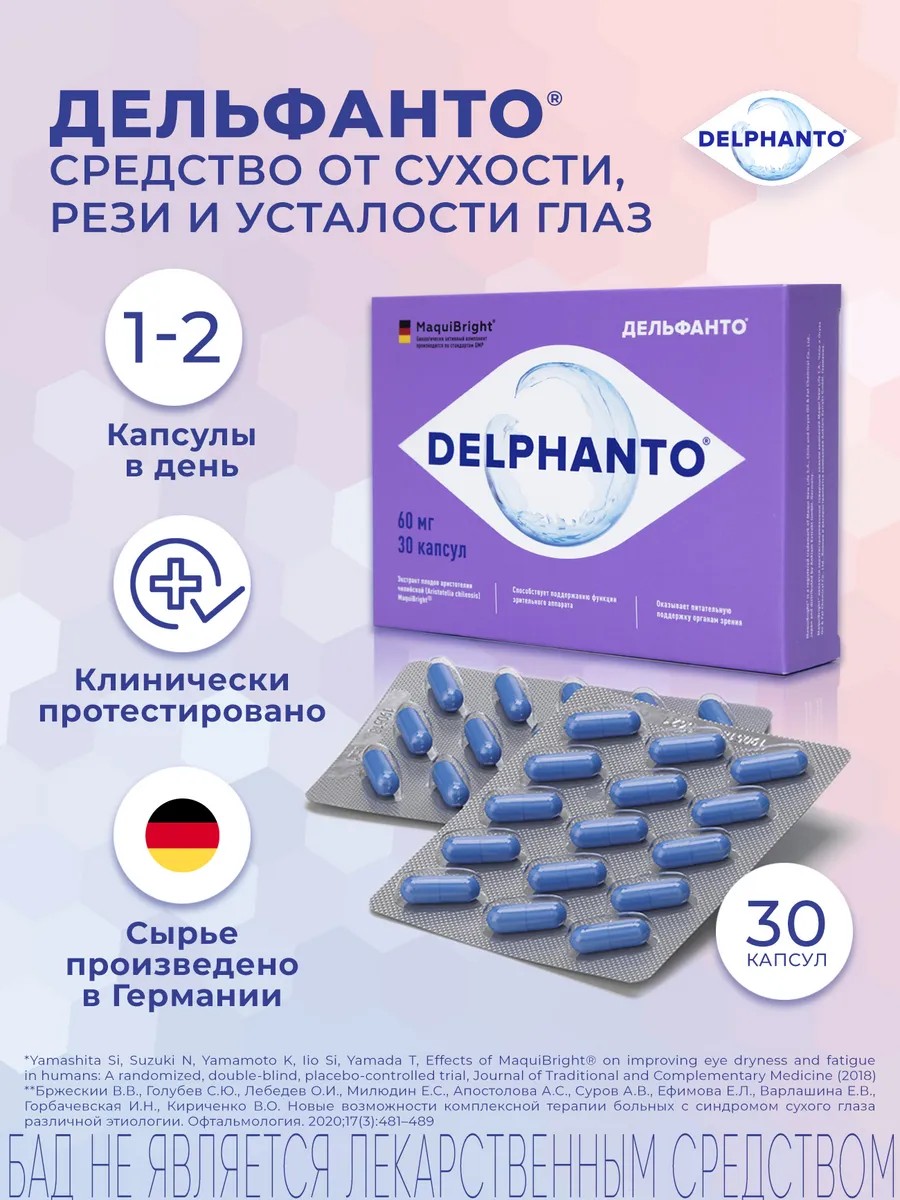 Капсулы Дельфанто - единственное средство на российском рынке в форме капсул, которое увеличивает выработку собственной слезы при синдроме "сухого глаза", питающей и защищающей роговицу. БАДы для глаз Дельфанто дарят комфорт и являются профилактикой язвы роговицы, способствуют улучшению зрения.