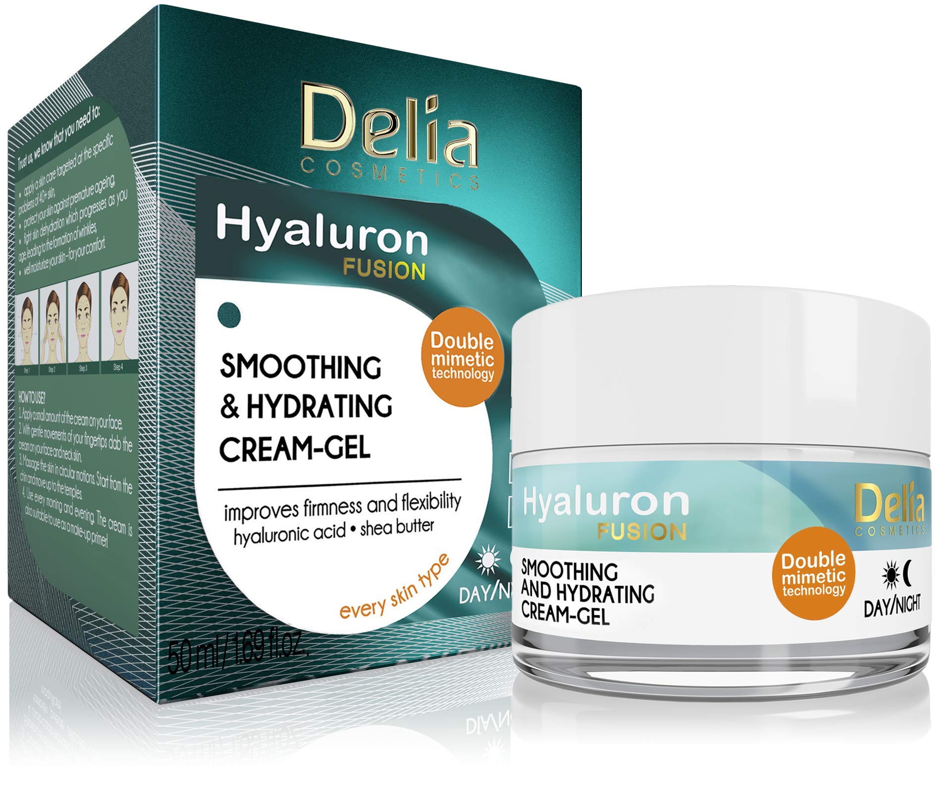 Delia Cosmetics - Hyaluron Fusion - Day and Night Cream Gel - Smoothing and Moisturizing - Elasticity Firmness Improvement - For Dry and Sensitive Skin - Active Ingredients - 50 ml