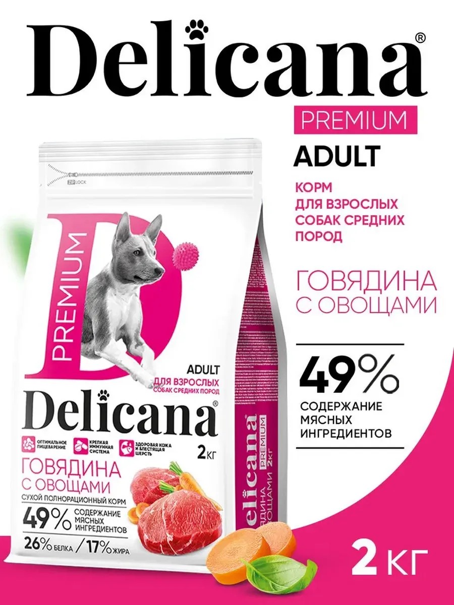 | Полное наименование товара | Деликана Сухой корм для собак средних пород говядина с овощами 2кг |