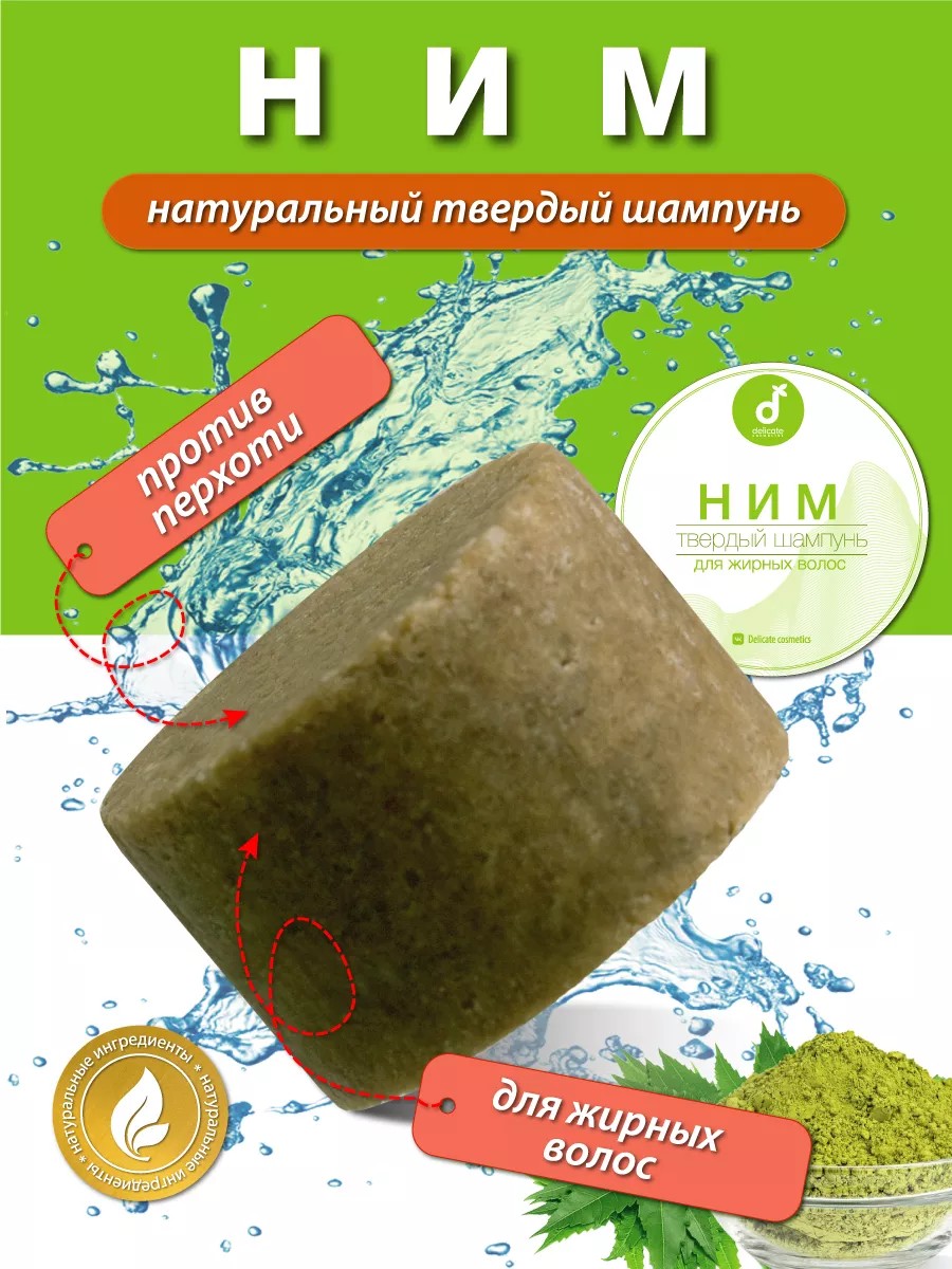 Натуральный твердый шампунь для жирных волос, от перхоти. Регулирует выработку себума. Уменьшает выпадение волос, питает, укрепляет и стимулирует рост новых. Рекомендуем для всех типов кожи головы, в том числе для чувствительной. Подоейдет для поврежденных, ломких, сухих, окрашенных, светлых. Кератин и протеины пшеницы предотвращают сухость, ломкость, увлажняют, улучшая структуру, возвращают здоровый блеск. Ним, эфирнные масла эвкалипта и лемонграсса устраняют жирность и оздоравливают кожу головы. Репейное и касторовое масла, экстракт крапивы насыщают витаминами и питательными элиментами. Все в совокупности обеспечивают наилучший результат для длинных, коротких, кудрявых, прмых, вьющихся волос. Регулярное использование твердого шампуня Ним сделает волосы сильными и густыми. Этим универсальным средством могут пользоавться девушки, женщины, парни, мужчины, в том числе для бороды и усов. Рекомендуем уходовую косметику подросткам, детям, мальчикам и девочкам. Лечебный шампунь для любого типа волос. Применяется от себореи, выпадения и облысения. Безсульфатный шампунь отличается высоким пенообразованием, ароматом натуральных эфирных масел и богатым составом активных компонентов. Не содержит парабены, консерванты, синтетические красители и силиконы. Подходит для ежедневного использования. Упакован в баночку. Имеет удобный дорожный формат, небольшой вес ( 50 грамм), легко помещается в косметичку, ручную кладь, не разольется в чемодане, в отличие от жидких форм аналогичных очищающих средств. Удобно брать с собой в поездку, отпуск, командировку или тренировку. Уверены, станет полезным, практичным подарком друзьям, родным и коллегам. Способ применения: намочите локоны, проведите шайбочкой и мягко помассируйте у корней, взбейте пену, тщательно смойте. После процедуры ему необходимо дать просохнуть. Храните на мыльнице со стоком для воды. Так будет еще экономнее.. Одного брусочка хватает на 3-4 месяца в зависимости от длины волос и частоты использования.