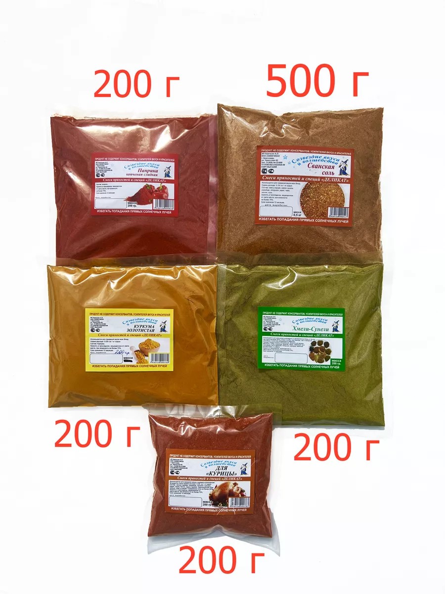 | Комплектация | Сванская соль 500г; Куркума золотистая 200г; Хмели-Сунели 200г; Приправа для курицы 200г; паприка молотая 200г |