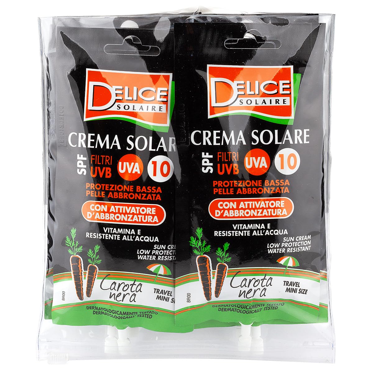 Sunscreen with black carrot tanning activator, fragrance-free, dermatologically tested. With low SPF tanning activator, vitamin E, water-resistant, dermatologically tested. The Delice Black Carrot line, thanks to the presence of botanical extracts that help activate melanin production and broad-spectrum UVA UVB sun filters and protection, allows for a fast and safe tan. The formula with vitamin E helps protect the skin from premature aging and dehydration. The convenient mini sachet makes the product ideal to take with you everywhere, even in your carry-on luggage. INSTRUCTIONS FOR USE Apply 30 minutes before sun exposure, 2 to 3 scoops for the entire body, and reapply every 2 hours or after swimming or sweating. SAFETY WARNING n.a. See moreSafe product, dermatologically tested. 6-month PAO (Period After Opening). Sunscreen suitable for all skin types, even the most sensitive. Its formula with vitamin E helps protect the skin from premature aging and dehydration. The convenient mini-sausage format makes it ideal to take everywhere, even in your carry-on luggage. The protective cream also contains a tanning activator that helps stimulate melanin production. This innovative SPF 10 sunscreen, thanks to its broad-spectrum UVA UVB filters, allows for a fast and safe tan.Delice Solaire Crème solaire Mini taille, protection basse SPF10 , avec activateur de bronzage carotte noire, résistante à l'eau, testée dermatologiquement – 6 sachets x 50 mlDESCRIPTION DU PRODUIT DESCRIPTION DU PRODUIT Protection solaire avec activateur de bronzage carotte noire, sans parfum, testé dermatologiquement. Avec activateur de bronzage protection basse, peau bronzée vitamine E, résistant à l'eau testé dermatologiquement. La ligne Delice Carotte noire, grâce à la présence d'extraits botaniques qui aident à l'activation de la production de mélanine et aux filtres solaires UVA UVB à large spectre et protection permet un bronzage rapide et sûr. La formulation avec de la vitamine E aide à protéger la peau du vieillissement précoce et des effets déshydratants. Le format pratique en sachet mini taille rend le produit idéal à emporter partout avec vous, même en avion dans le bagage à main. MODE D'EMPLOI Appliquer 30 minutes avant l'exposition au soleil, 2 à 3 cuillères pour le corps entier, et réappliquer toutes les 2 heures ou après la natation ou la transpiration. AVERTISSEMENT DE SÉCURITÉ n.a. Voir plusProduit sûr, testé dermatologiquement. PAO 6 mois. Crème de protection solaire adaptée à tous les types de peau, même les plus sensibles. Sa formulation avec de la vitamine E aide à protéger la peau du vieillissement précoce et des effets déshydratants. Le format pratique en sachet mini taille rend le produit idéal à emporter partout avec vous, même en avion dans le bagage à main. La crème protectrice contient également un activateur de bronzage qui aide à l'activation de la production de mélanine. Crème solaire innovante SPF10 qui, grâce aux filtres solaires UVA UVB à large spectre, permet un bronzage rapide et sûr.