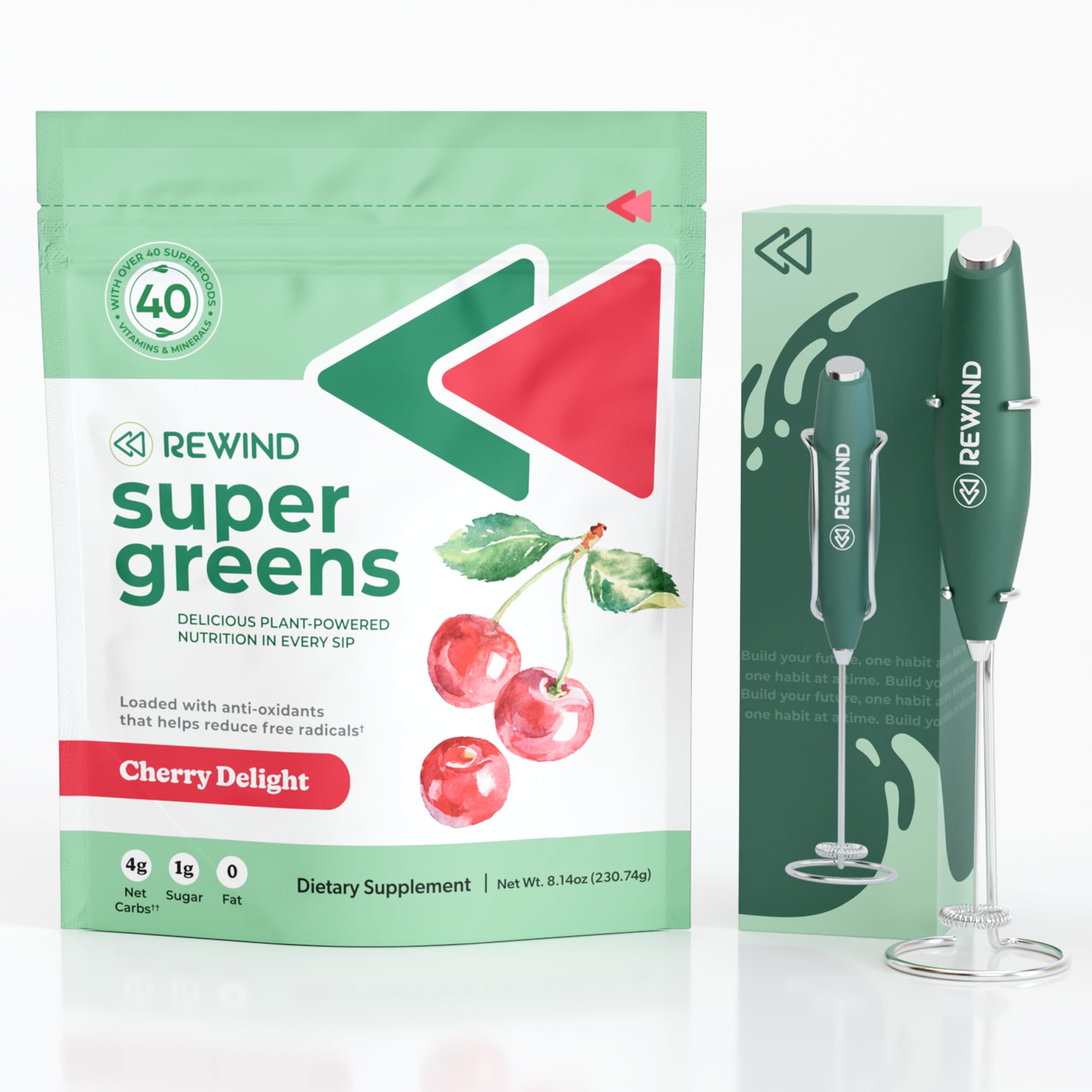 The Right Way is to Rewind: Rewind Greens offers a superfoods powder you can trust, made with a clean, vegan formula free of fillers, colors, and added sugars—just pure, guilt-free goodness. Packed with delicious flavors and essential nutrients, it's the perfect way to fuel your body and power through the day, all while supporting your health with a product made in the USA. Rewind Your Way To Optimal Health: We designed our Rewind Greens and Frother bundle to make it easy to incorporate daily greens into your everyday routine. Simply scoop your greens, mix with the frother using the easy-to-use power button, and once it reaches the perfect consistency, enjoy! For extra fun, try adding your Rewind Greens to almond milk, coconut milk, a smoothie, or any drink you prefer for a delicious, nutritious twist. High-Quality Frothing Wand: Powered by two AA batteries, the lightweight Rewind Frother is crafted with stainless steel, ensuring both durability and long-lasting performance. Its high-quality materials are built to withstand daily use, delivering consistent, reliable results every time, making your greens drink preparation effortless and enjoyable. This hand frother blends and froths drinks like coffee, tea, milk, and juice, making it the perfect versatile tool for all your beverage needs. Elevate Your Green Juice Experience: The Rewind Frother is an electric stirrer that makes mixing your Rewind Greens effortless, thanks to its ergonomic soft-touch handle and durable stainless steel whisk. With just a quick blend using this hand froth mixer, you can create a perfectly smooth greens drink, ensuring an enjoyable experience every time. Your Greens Have Never Tasted This Good: Rewind Greens makes getting your daily dose of superfoods a treat, with delicious, fun flavors that'll make you forget you're drinking green juice! Packed with a powerful blend of multivitamins, minerals, and nutrient-dense foods, each serving is designed to nourish your body and boost your energy. With our greens powder and frother, you're not just taking a supplement—you're seamlessly fueling your body for optimal health and vitality every da.