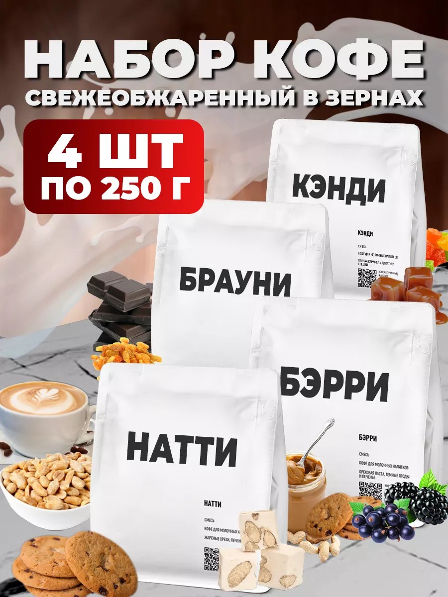 Набор кофе (4 упаковки по 250г): натуральный свежеобжаренный кофе в зернах КЭНДИ, НАТТИ, БЭРРИ , БРАУНИ. Полный комплект, вся линейка для любителей кофе с молоком!