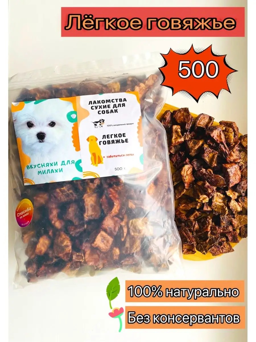 Лакомство для собак - 100 % натуральный продукт. Легкое говяжье для собак. Вкусняшки для собак. Собственое производство из Сибири. Корм для собак соответствует Ветеринарно- санитарным нормам и требованиям к качеству продукции. При изготовлении лакомств используются профессиональные сушильные камеры. Сушёные лакомства "Вкусняхи для милахи" изготавливаются из свежего сырья, с высоким содержанием микроэлементов, таких, как, селен, медь, цинк, железо, фосфор, натрий, калий, магний, кальций, витаминов В12, В5, С, РР и др., необходимых для гармоничного развития собаки. Легкое говяжье также оказывает положительное воздействие на состояние кожи, шерсти и общий обмен веществ. Продукт, имеет натуральный запах и вкус, который очень нравится собакам крупных и мелких пород. Кусочки удобно использовать в качестве поощрения при дрессировке.Легкое говяжье также оказывает положительное воздействие на состояние кожи, шерсти и общий обмен веществ. Натуральные зубочистки для чистки зубов подходят для маленьких, средних, больших пород собак, для щенков, кошек, хорьков и всеядных грызунов. Долгоиграющие вкусняшки полностью натуральные, изготовлены без консервантов по технологии, сохраняющей естественный вкус и аромат. Рекомендуемая норма потребления не более 10% от суточного рациона.