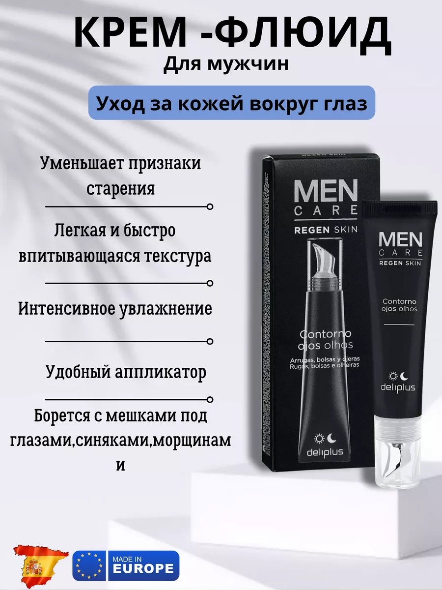 Крем для век мужской уменьшает отечность и темные круги, восстанавливая эластичность и упругость кожи благодаря увлажнению и подтягивающему эффекту. Крем от темных кругов под глазами предотвращает появление морщин, восстанавливая эластичность кожи вокруг глаз. Крем вокруг глаз подходит для всех типов кожи. Мужской крем для глаз содержит активные ингредиенты: Активный бакучиол природного происхождения, который действует как "ретиноподобный", помогая обратить вспять признаки старения. Мужской крем для век содержит растительный экстракт с укрепляющим и подтягивающим действием. Крем вокруг глаз от морщин наносить утром и вечером на чистую кожу. Избегать прямого контакта с глазами. Испанский мужской крем для кожи вокруг глаз.