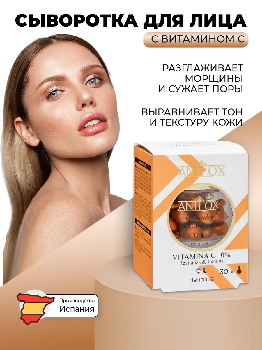 Антиоксидантная сыворотка для лица и в капсулах Витамин С содержит 10% чистого стабилизированного витамина C и витамина Е! Мощная формула сыворотки с Витамином С выравнивает тон и текстуру кожи, способствует разглаживанию морщин и сужению пор. Сразу после ее нанесения кожа выглядит более увлажненной, сияющей и гладкой. Активные ингредиенты сыворотки с витамином С: Чистый стабилизированный витамин C (аскорбиновая кислота- ASCORBIC ACID) в концентрации 10% – мощный антиоксидант, который помогает предотвратить ранние возрастные изменения. Он обеспечивает заметный осветляющий эффект, способствует выравниванию тона кожи и придает ей сияние. Витамин E (токоферол) обладает антиоксидантными свойствами. Способ применения: Дважды в день наносите по 2-3 капли сыворотки на очищенную кожу лица и шеи. Откройте капсулу, осторожно повернув верхнюю часть. Вылейте содержимое капсулы и нанесите на чистую кожу. Распределите средство по лицу до полного впитывания. 30 капсул по 0,5 мл.