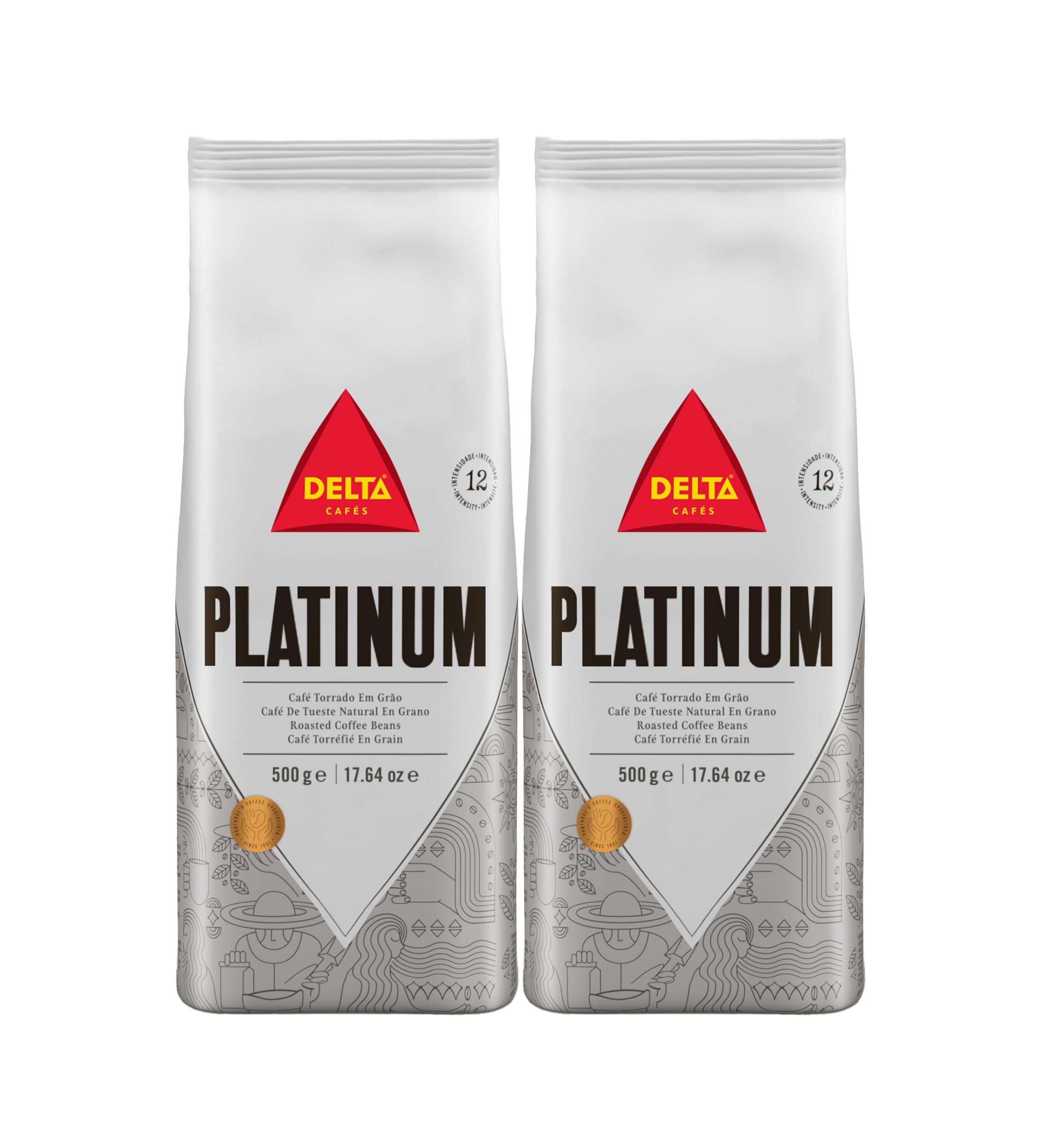 Delta Cafés Café en Grains Platinum, Paquet de 2 x 500 g, Espresso Intense, Arabica Robusta, Notes Chocolatées Fruitées, Pour Machines Automatiques et Moulins