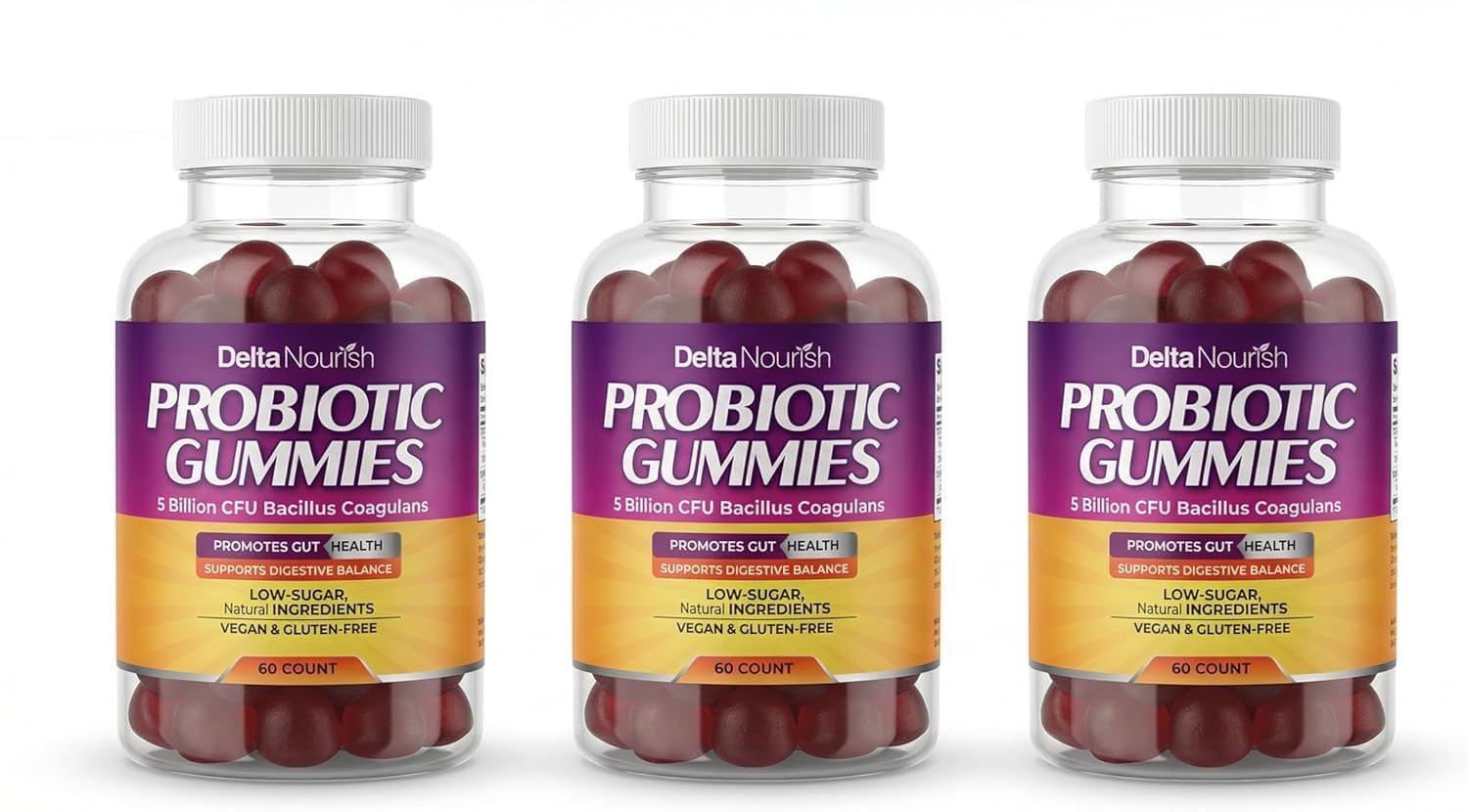 The Delta Nourish Probiotic Gummies are formulated to support daily gut, digestive and immune health as part of a balanced adult wellness routine. Each serving delivers 5 billion CFU of Bacillus coagulans in a soft, easy-to-chew gummy, helping to maintain gut balance and digestive comfort without the need for pills, powders or water. Designed for consistent daily use, these probiotic gummies fit seamlessly into busy lifestyles while supporting long-term digestive wellness and overall vitality. A healthy gut plays an important role in nutrient absorption and immune function, making daily probiotic support a valuable addition to everyday health for both men and women. Made with a clean, non-GMO, vegan and gluten-free formula, Delta Nourish Probiotic Gummies contain no added sugar or unnecessary additives, making them suitable for health-conscious and plant-based lifestyles. The naturally enjoyable mixed berry flavour makes daily use simple and pleasant. Shelf-stable and easy to take anytime, these gummies are ideal for home, work or travel, offering reliable probiotic support wherever life takes you. FEATURES Daily probiotic gummies for adults Supports gut and digestive balance Helps promote immune health 5 billion CFU per serving Made with Bacillus coagulans Vegan and gluten-free formula Non-GMO with no added sugar Shelf-stable, no refrigeration needed Easy, chewable gummy format Delicious mixed berry flavour : These digestive support health supplements come in soft, chewable gummies with a tasty mixed berry flavor. They are easy to enjoy anytime, making daily gut support simple, enjoyable, and easy to maintain. - : These gut health probiotics are made with a carefully crafted non-GMO formula designed for daily adult use. They are vegan, gluten free, gelatin free, and sugar free, providing a clean and reliable probiotic option for health-conscious lifestyles. , : These probiotic supplements support digestive balance while contributing to immune system health. They help reduce bloating, promote smoother digestion, and help strengthen the body's natural immune defenses for reliable daily wellness support. : These gut health gummies are made using carefully selected, high-quality ingredients to deliver consistent probiotic support you can trust. They contain no artificial flavours, colours or unnecessary additives, offering a cleaner and more mindful choice for daily supplementation. : These probiotic gummies are formulated with 5 billion CFU of Bacillus coagulans to help maintain a healthy balance of beneficial gut bacteria in the digestive system. They provide gentle, plant-based probiotic support designed for everyday use without harsh ingredients, making them suitable for long-term digestive wellness.