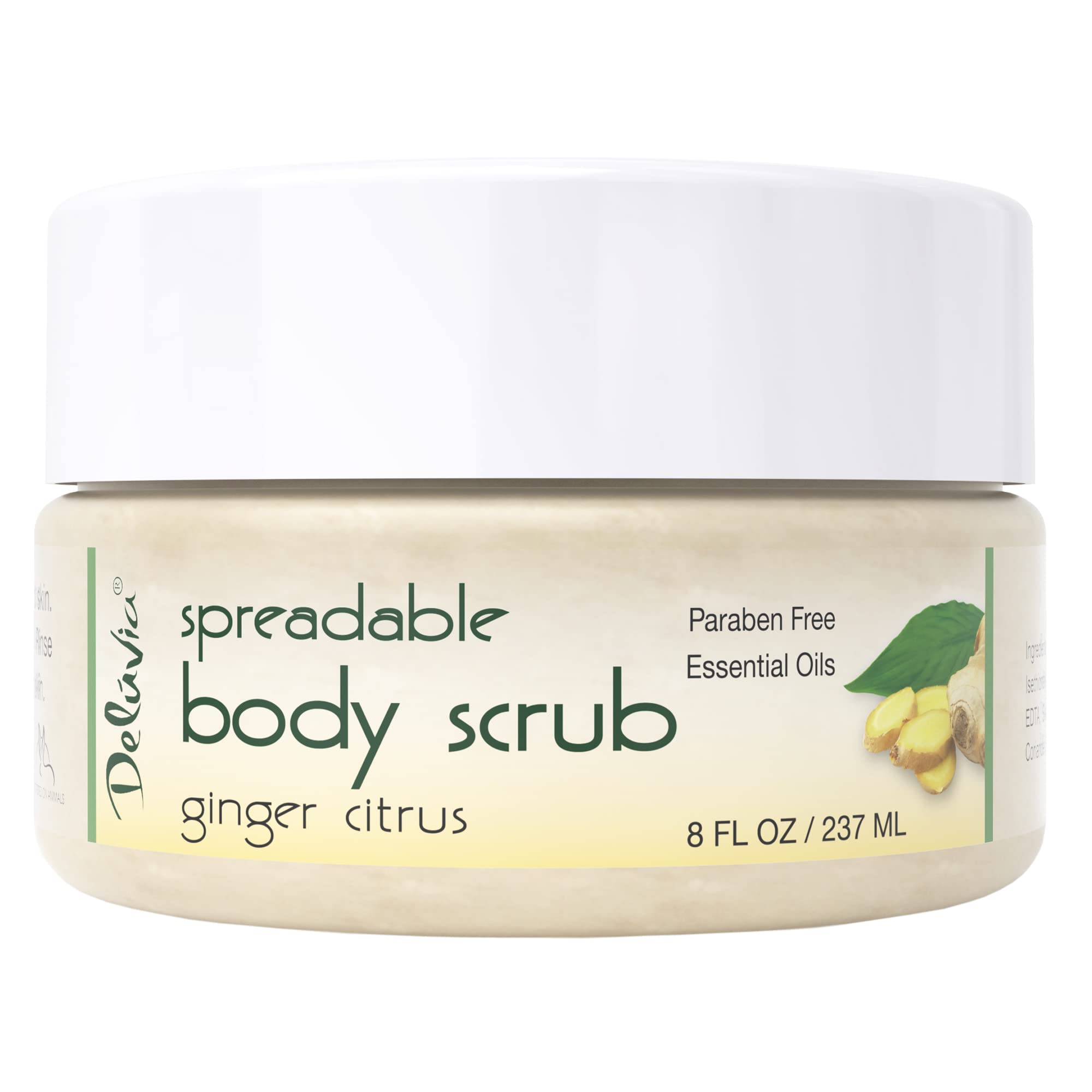 100 SATISFACTION GUARANTEED! If you are not satisfied for any reason contact us within 30 days of purchase and we will either replace the product or send you a refund. We are cruelty free and proudly made in the USA. REFRESHED AND REJUVINATED. The essential oils we use in our body scrub have a refreshing scent that both men and women will appreciate. The essential oils of ginger and citrus soothe the senses allowing you to start your day refreshed or wind down your night relaxed. OUR DELUVIA SPREADABLE BODY SCRUB has a unique, non-oily, creamy texture. It works well on all skin types: dry, oily, combination and sensitive skin alike. Can be used day and night. GENTLE DAILY EXFOLIATION WHILE KEEPING YOUR SKIN MOISTURIZED. Our salt scrub is a great exfoliator as it uses mineral rich Dead Sea Salts to help remove the dead skin, while working with the essential oils to leave your skin soft and smooth. Exfoliating and moisturizing are key to younger looking skin. QUALITY INGREDIENTS FOR MAXIMUM BENEFITS. Our Dead Sea Salt Scrub is made with Sweet Almond Oil, Vitamin E and Essential Oils from Grapefruit, Coriander, Eucalyptus, Ginger, Clove, Lime, Orange, Bergamot and Lemon. It is paraben free, cruelty free and proudly Made in the USA.