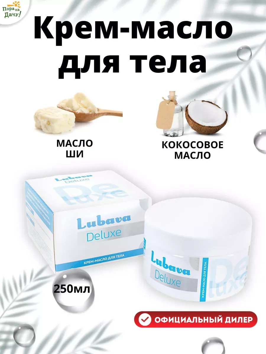Крем масло Любава идеально подходит для ухода за кожей рук, ног и тела. Густая, насыщенная текстура крема, похожая на сливочное масло, разработана на основе твердых масел с добавлением увлажняющих компонентов и витаминов питает и увлажняет сухую кожу. Крем Любава профессиональный уход за очень сухой кожей рук, ног, пяток и локтей. Базой крема служат масло ши и кокосовое масло, которые ценны своими питательными и увлажняющими свойствами. Органическое масло оливы питает, смягчает и увлажняет кожу рук и тела, удерживая в ней влагу на длительное время, при этом не забивая поры. Витамин А повышает синтез коллагена, эластина, гиалуроновой кислоты в клетках кожи, повышает её плотность, уменьшает гиперпигментацию. Витамин Е выводит токсины, улучшает цвет кожи, способствует быстрому заживлению повреждений на руках и пятках, обладает успокаивающим эффектом, нормализует обмен веществ. Кокосовое масло — густая питательная основа, восстанавливает очень сухую кожу и придаёт ей невероятную мягкость и нежность. Масло Ши активно питает, увлажняет кожу, повышает её упругость, «стирает» следы увядания. Густое питательное крем масло для тела Любава Deluxe моментально впитывается, делая кожу необычайно мягкой и бархатистой. Применение: массажными движениями нанести небольшое количество крема на кожу до полного впитывания.