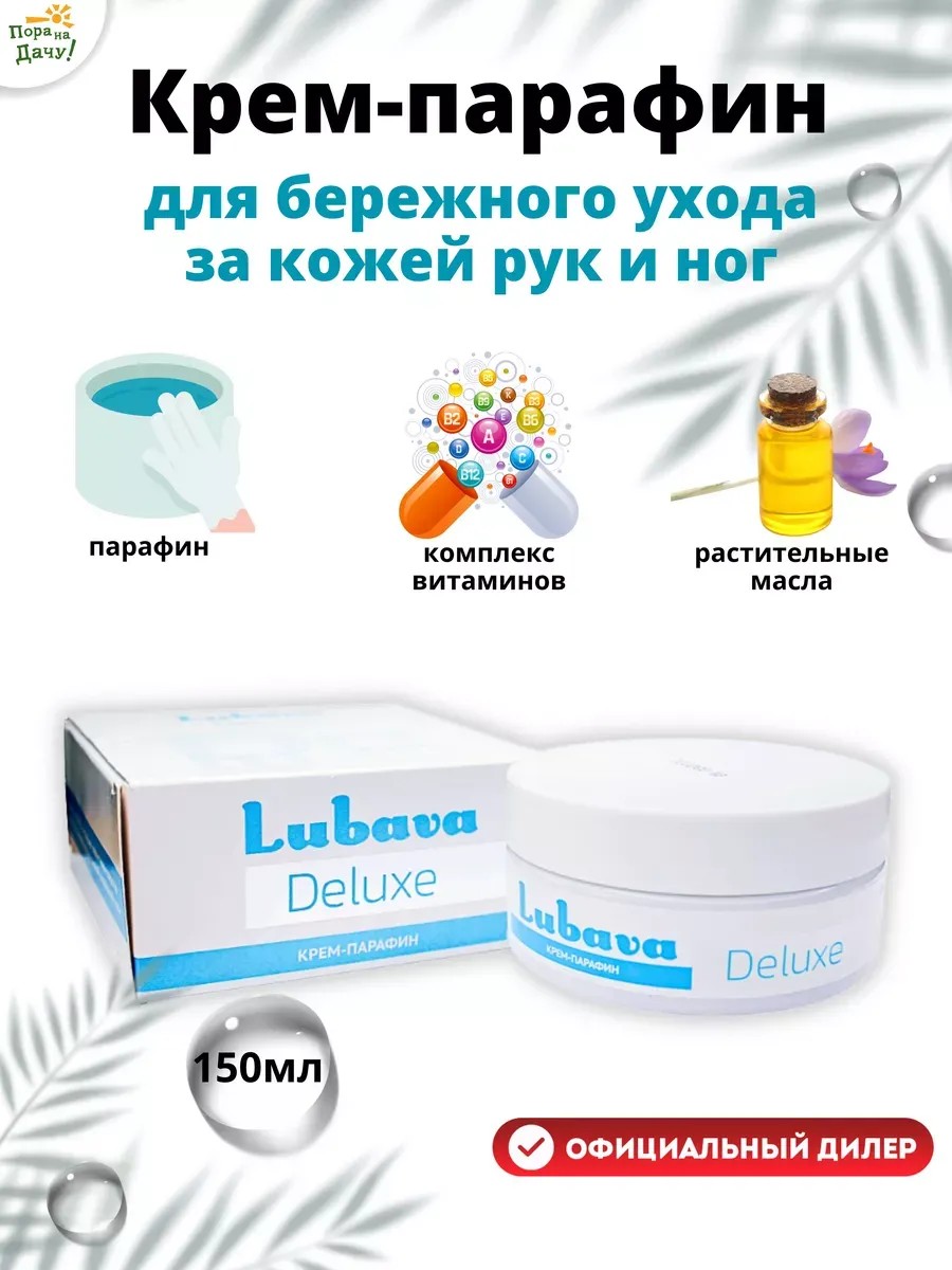 Lyubava Deluxe Paraffin Cream is designed for gentle care of the skin of the hands and feet. It is an effective remedy for restoring dry, thickened, and rough skin of the feet, palms, knees, and elbows. It contains a complex of oils and vitamins that intensively moisturize and nourish the skin. With regular use, the skin becomes soft and velvety, and fine wrinkles are smoothed out. It has a strengthening effect on nails and softens cuticles. How to use: Degrease the skin with a toner, and use a scrub to remove dead skin cells. Apply a thin layer of nourishing cream to the skin, then apply a layer of paraffin cream. Cover with a protective film and heat-retaining material. After 15-20 minutes, remove any remaining paraffin cream with a dry cloth. Do not apply the product to damaged skin.