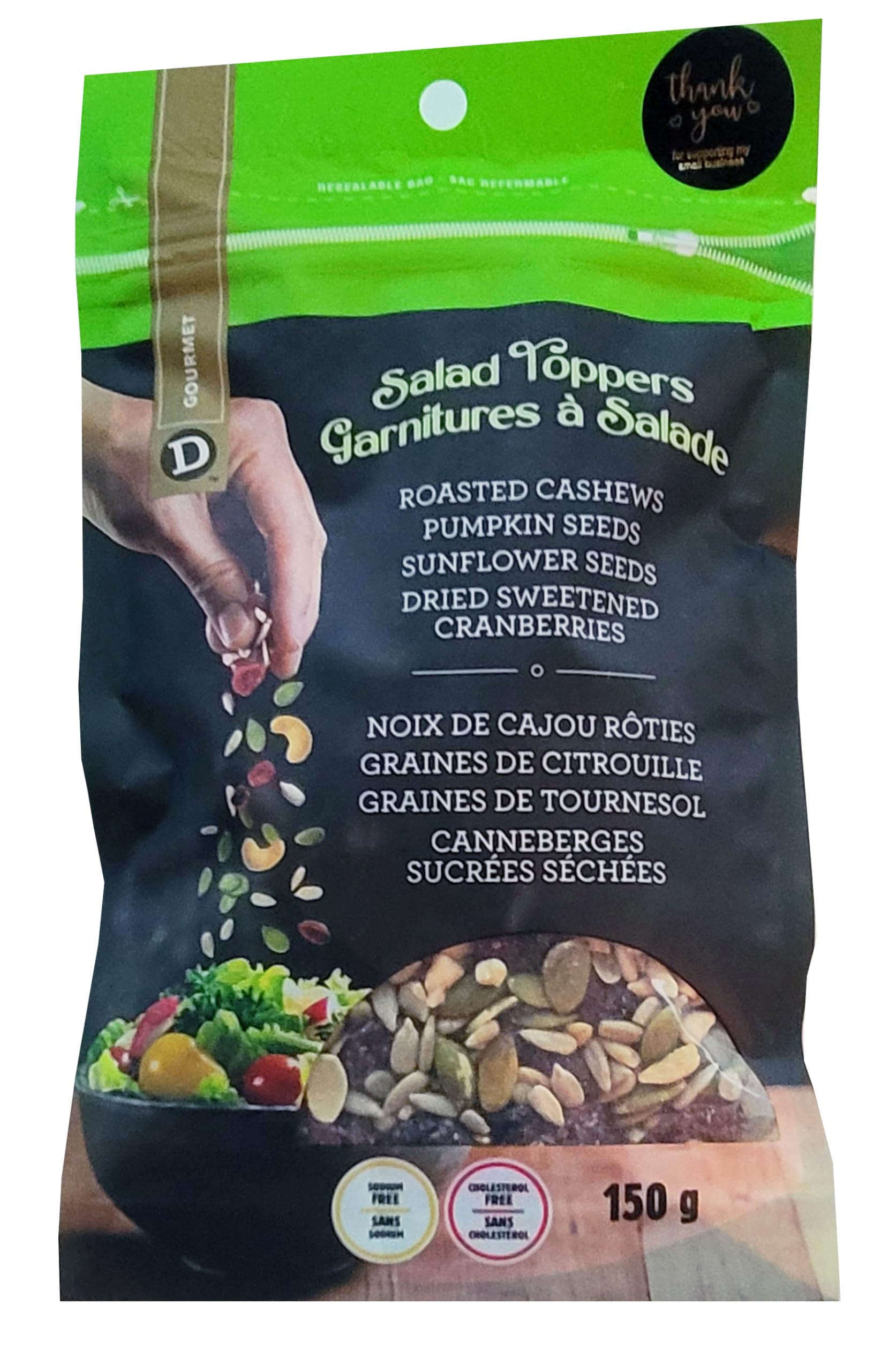 Elevate Your Salads with Our Deluxe Salad Toppers - A Symphony of Crunch and Flavor! Are you tired of the same old, uninspiring salads? Ready to take your greens to the next level? Our Salad Toppers, a delightful blend of roasted cashews, pumpkin seeds, sunflower seeds, and dried sweetened cranberries, are here to transform your salad game. Key Features: Nutty Elegance: Indulge in the rich, buttery goodness of roasted cashews that add a luxurious crunch and a hint of savory to your salads. Seeds Galore: The perfect combination of pumpkin seeds and sunflower seeds provides a nutty and earthy profile, adding texture and wholesome goodness. Sweet Surprise: Dried sweetened cranberries infuse a burst of sweetness, balancing the nuttiness with a touch of tartness. It's a delightful contrast that makes your salads truly special. Vibrant Colors: Not only do these toppers enhance the taste of your salads, but they also bring vibrant colors and eye-catching appeal to your dishes. Packed with Nutrients: Each component in our Salad Toppers is a nutritional powerhouse. You're getting a boost of healthy fats, protein, vitamins, and minerals in every bite. Versatile Use: These toppers aren't just for salads. They make a fantastic addition to yogurt, oatmeal, or even as a standalone snack. Ingredients: Roasted Cashews Pumpkin Seeds Sunflower Seeds Dried Sweetened Cranberries Serving Suggestions: Simply sprinkle over your favorite salad for an instant upgrade. Mix into your morning cereal or oatmeal for an extra layer of texture and flavor. Enjoy as a guilt-free snack right out of the bag. Experience the delightful fusion of flavors and textures in every bite. Discover the perfect complement to your greens. Order our Deluxe Salad Toppers today and elevate your salads to a whole new level of gourmet deliciousness!Versatile Use: These toppers aren't just for salads. They make a fantastic addition to yogurt, oatmeal, or even as a standalone snack. Packed with Nutrients: Each component in our Salad Toppers is a nutritional powerhouse. You're getting a boost of healthy fats, protein, vitamins, and minerals in every bite. Vibrant Colors: Not only do these toppers enhance the taste of your salads, but they also bring vibrant colors and eye-catching appeal to your dishes. Sweet Surprise: Dried sweetened cranberries infuse a burst of sweetness, balancing the nuttiness with a touch of tartness. It's a delightful contrast that makes your salads truly special. Seeds Galore: The perfect combination of pumpkin seeds and sunflower seeds provides a nutty and earthy profile, adding texture and wholesome goodness. Nutty Elegance: Indulge in the rich, buttery goodness of roasted cashews that add a luxurious crunch and a hint of savory to your salads.