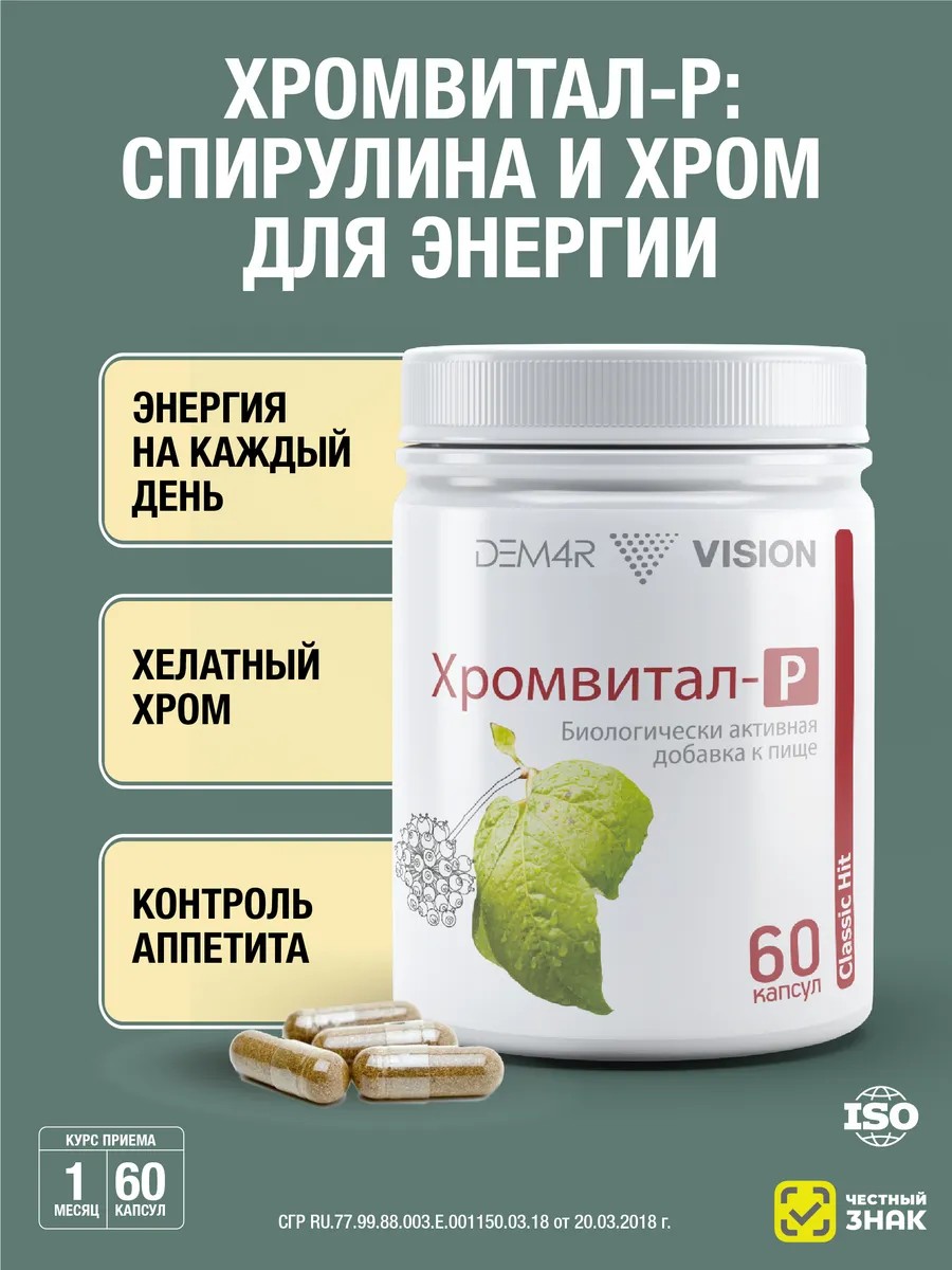 Натуральный растительный энергетик Хромвитал-Р от ДЕМ4Р - отличная альтернатива вредным продуктам, которые только временно повышают и поддерживают тонус организма при хронической усталости. Комплекс ранее выпускался компанией Vision (Визион, Вижен).