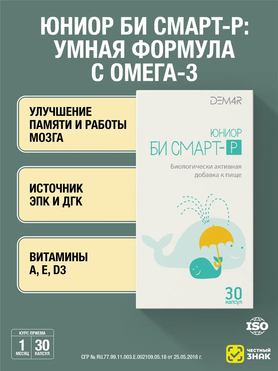 Детская омега Юниор Би Смарт-Р обеспечивает полноценное развитие центральной нервной системы, положительно влияет на настроение, снижает раздражительность, способствует улучшению социальной адаптации, понижает гиперактивность и импульсивность, тем самым улучшая поведение ребенка.