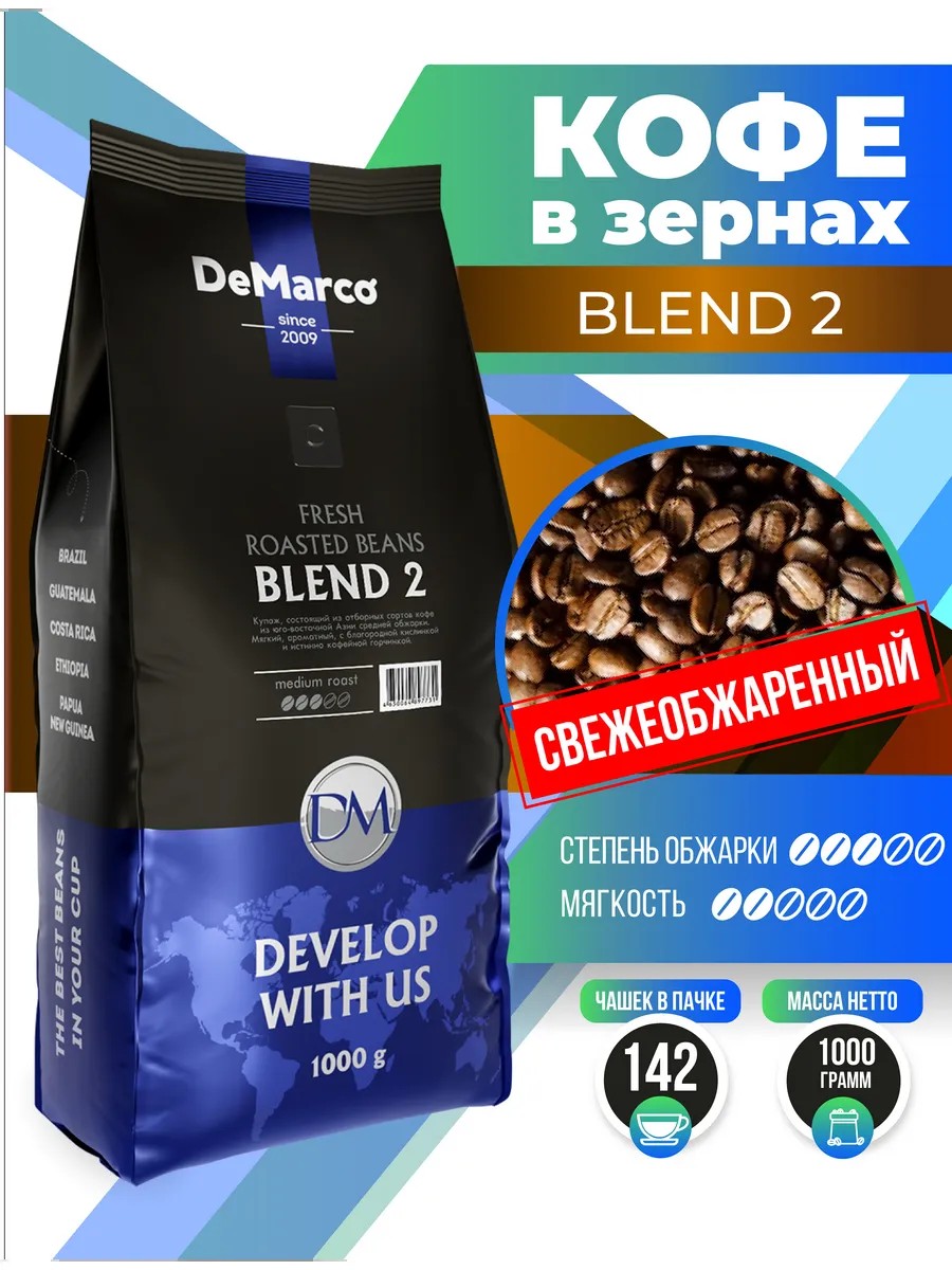 Freshly roasted natural roasted beans Fresh Roast Blend 2, 1000 grams. A new coffee blend consisting of selected coffee varieties from Southeast Asia, medium roast. The taste is soft, aromatic, with a noble acidity and a true coffee bitterness. - Roast: medium; - Dosage: 7 g per 150 ml of water. - Coffee flavor: rich. - Coffee flavor shade: bitterness. ------------ Our production capacity and technology allow us to roast coffee beans immediately before shipment to the marketplace warehouses, so customers value our coffee for its fresh roast. DeMarco occupies a leading position in Russia and neighboring countries in sales of coffee, coffee ingredients for coffee shops and vending machines.