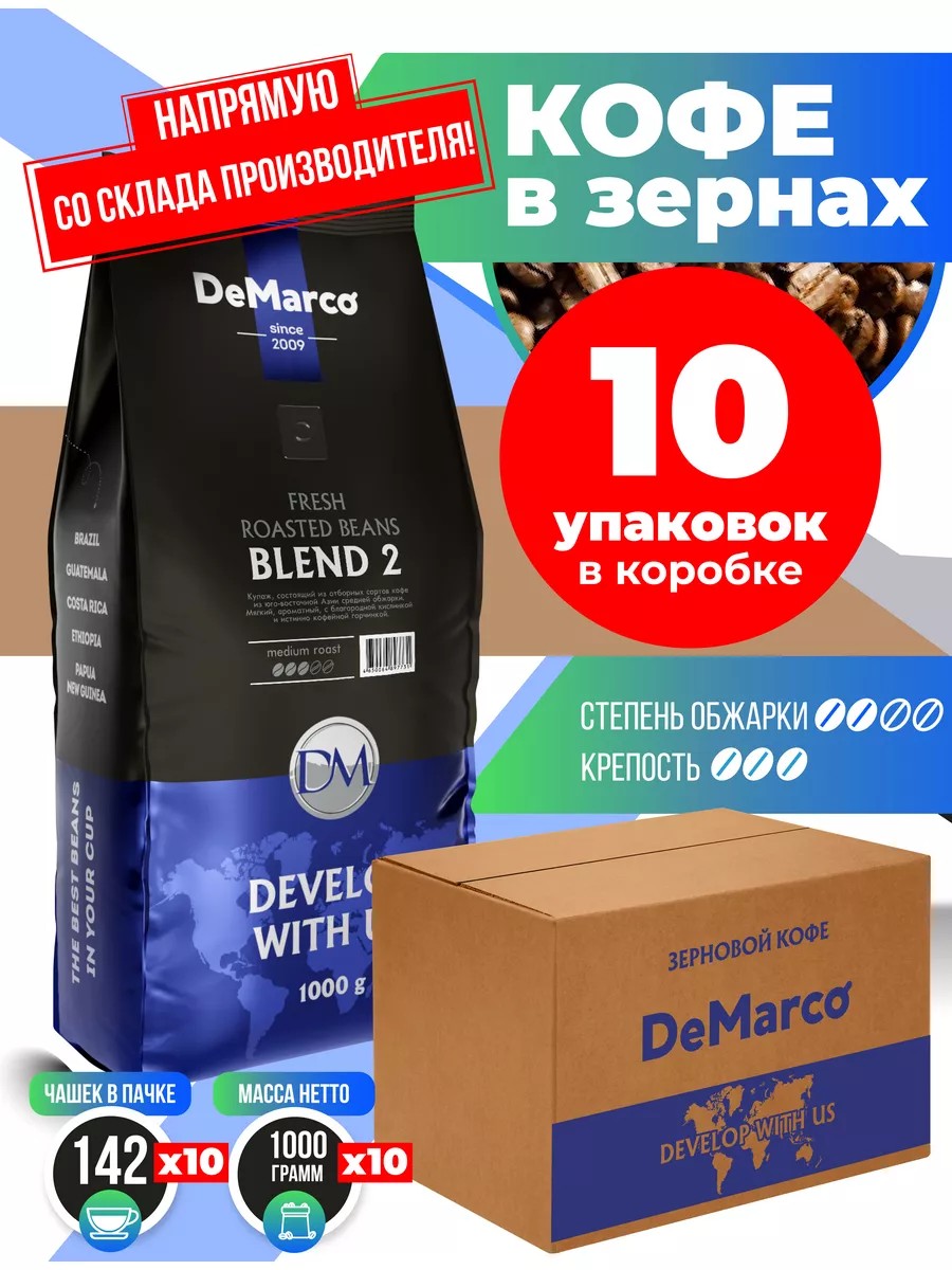 Freshly roasted natural roasted beans Fresh Roast Blend 2, 10 packs of 1000 grams per box. A new coffee blend consisting of selected coffee varieties from Southeast Asia, medium roast. The taste is soft, aromatic, with a noble acidity and a true coffee bitterness. - Roast: medium; - Dosage: 7 g per 150 ml of water. - Coffee flavor: rich. - Coffee flavor shade: bitterness. ------------ Our production capacity and technology allow us to roast coffee beans immediately before shipment to the marketplace warehouses, so customers value our coffee for its fresh roast. DeMarco occupies a leading position in Russia and neighboring countries in sales of coffee, coffee ingredients for coffee shops and vending machines.