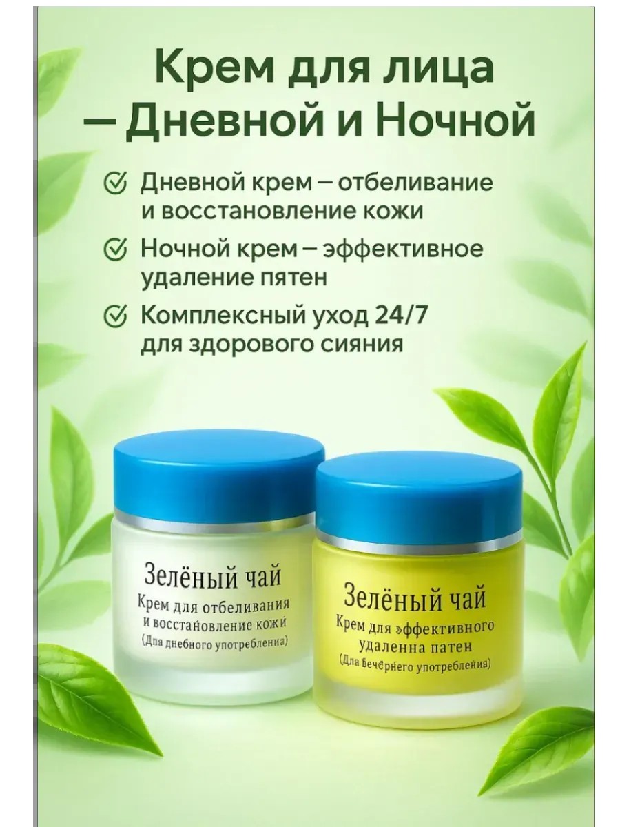 | Полное наименование товара | Крем с зеленым чаем дневной и ночной от пигментных пятен |