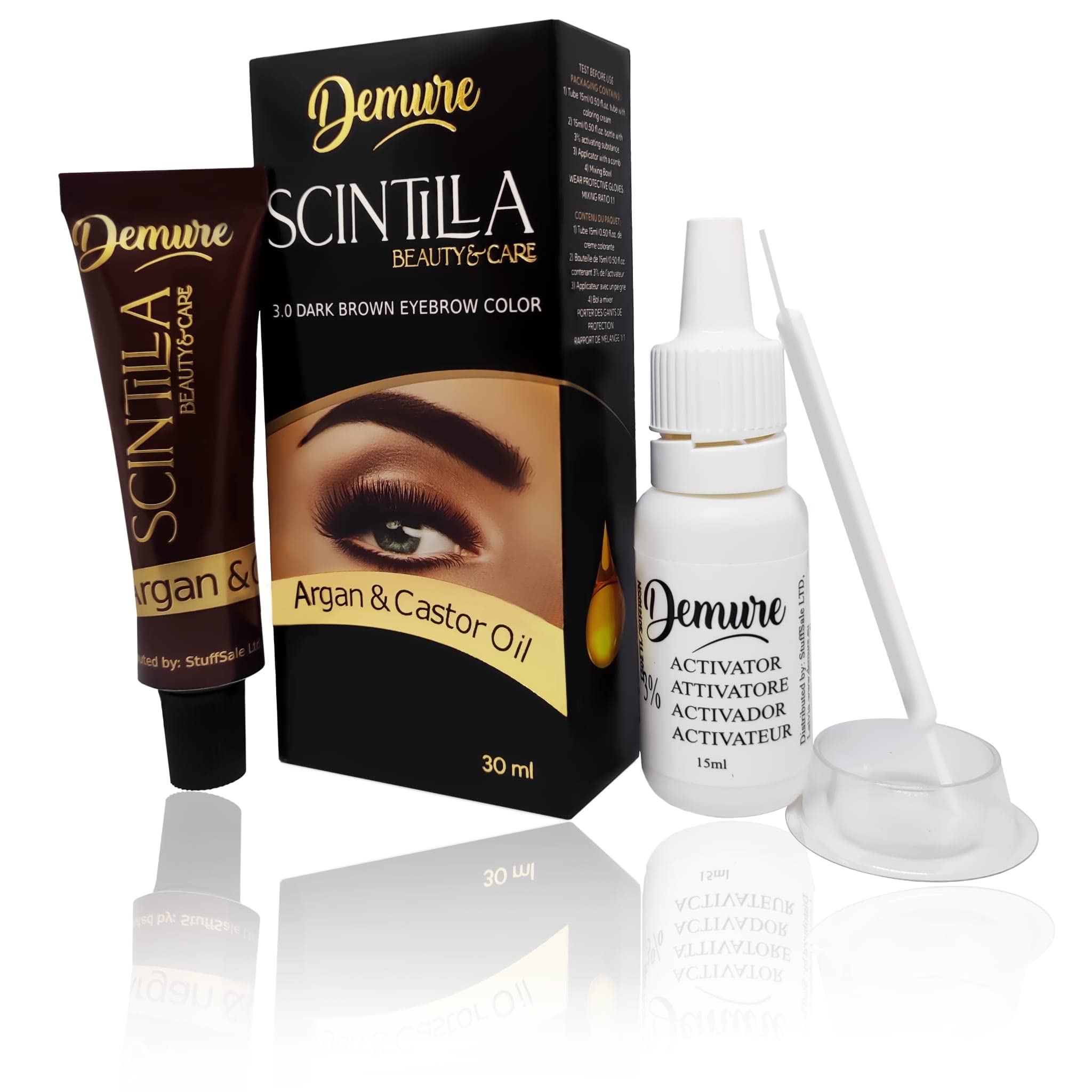 Demure Eyebrow Dye Kit Professional Formula Brow Tint - contains Argan Oil & Castor Oil (Omega 6 Carotene Vitamins F) Fast and Safe Results (3.0 Dark Brown)