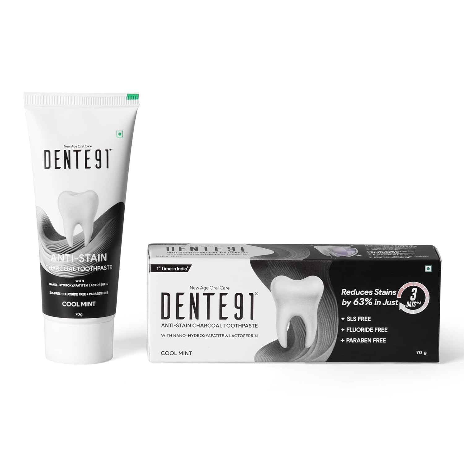 Say goodbye to surface stains with every brush. Try it today and experience the brilliance of charcoal toothpaste!. Harnessing the power of Lactoferrin, the toothpaste boasts antimicrobial properties that eliminate bacteria and fungi, combat bad breath, and effectively address gum disease. Cutting-edge formula, enriched with Nano Hydroxyapatite, fortifies enamel, alleviates sensitivity, and repairs cavities for optimal oral health. Potent stain-fighting formula, enhanced with SHMP tackles stubborn discoloration gently yet effectively, while PVP improves whitening. Free from SLS, Fluoride Paraben. Revolutionize your oral care routine with the high abrasive potential of charcoal toothpaste for a brighter, healthier smile. Infused with the purifying properties of charcoal, Dente91 toothpaste effectively removes stains, and promotes oral health.