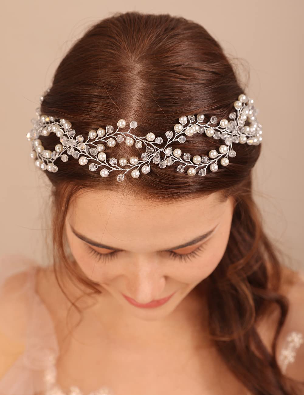 Deniferymakeup Pearl Bride Wedding Hair Vine Crystal Bridal Hair Accessories Wedding Headpiece for Women and Girls (Silver)