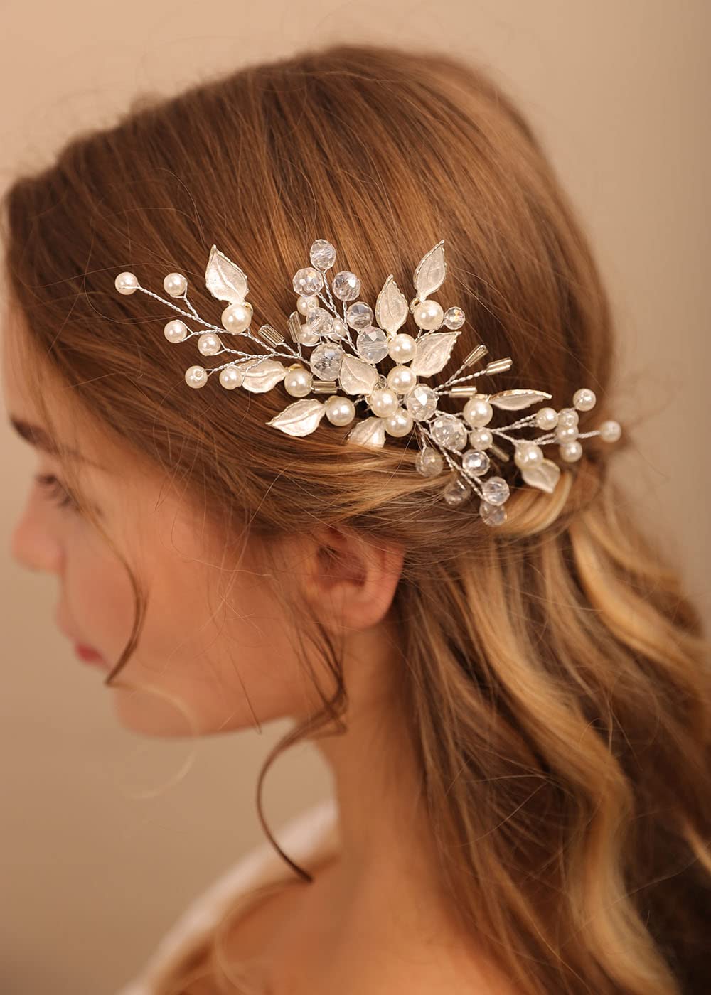 Deniferymakeup Wedding Pearl Hair Comb Silver bridal Leaf Hair Combs Headpiece Vintage Pearl Side Comb Crystal Hair Comb Decorative Hair Accessories for Women and Girls