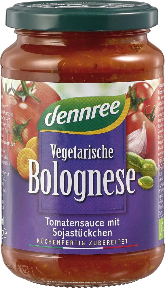 Taste: Conventional ingredients: Conventional ingredients: Acidifier: Citric acid. Preparation: Organic vegetarian Bolognese offers pure pleasure. Dennree vegetarian Bolognese is made from sun-ripened Italian tomatoes, soy pieces, and aromatic vegetables. Enjoy the mild and spicy taste. Preparation: Heat in a saucepan over medium heat, do not boil. Stir occasionally. Certification: EU Organic Label INGREDIENTS Tomatoes 69 , vegetables 15 by weight: onions, carrots, celery, soy 10 , extra virgin olive oil, sea salt, pepper, marjoram, garlic, chili pepper, acidifier: citric acid
