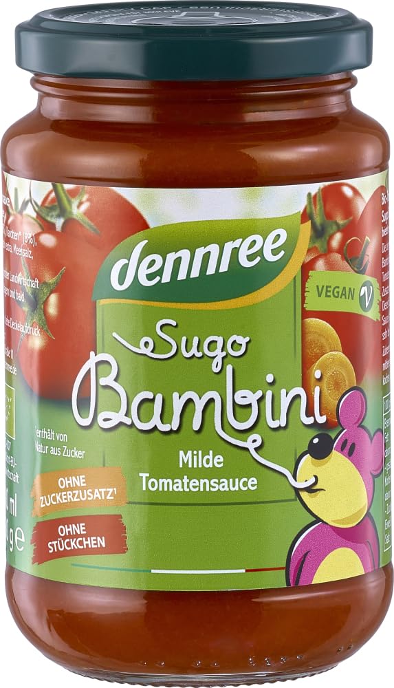 Production: Sugo Bambini organic tomato sauce offers pure enjoyment. Dennree's Sugo Bambini tomato sauce is made from sun-ripened tomatoes and vegetables according to a traditional recipe. This fruity and slightly spicy sauce is very popular, especially with children. Enjoy the sweet and fruity taste. Preparation: Heat in a saucepan over medium heat, do not boil. Stir occasionally. Certifications: EU Organic Label, German State Organic Label INGREDIENTS Tomatoes 88 , vegetables 7.5 (carrots, onions, celery in varying weights), extra virgin olive oil, cane sugar, sea salt, parsley, basil