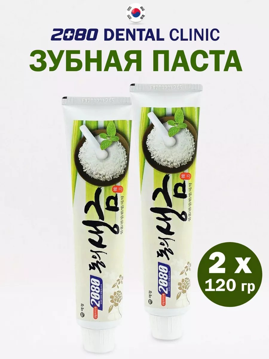 Dental Clinic 2080 Toothpaste Set for Sensitive Teeth and Gums. Medicinal herbs and biosalts with fluoride for ideal oral hygiene. This Korean gel toothpaste contains natural herbal extracts known in Eastern medicine that relieve tooth and gum sensitivity, prevent bleeding, and stimulate mucosal tissue regeneration. This professional fluoride toothpaste gently cleanses teeth from plaque, preventing the formation of cavities and tartar, even when wearing braces. Vitamin E stimulates blood circulation in the gums, strengthening them and making them more elastic. This comprehensive toothpaste protects against periodontal disease, gingivitis, and bacteria that cause bad breath. Fluoride strengthens tooth enamel and protects against demineralization, preventing cavities and treating them at the white spot stage. The tooth gel has a soft, refreshing taste and improves the aesthetics of a smile. Fluoride content: 0.1%. Formula free of hazardous ingredients. Use with Korean Dental Clinic 2080 toothbrushes. Volume: 125 ml.