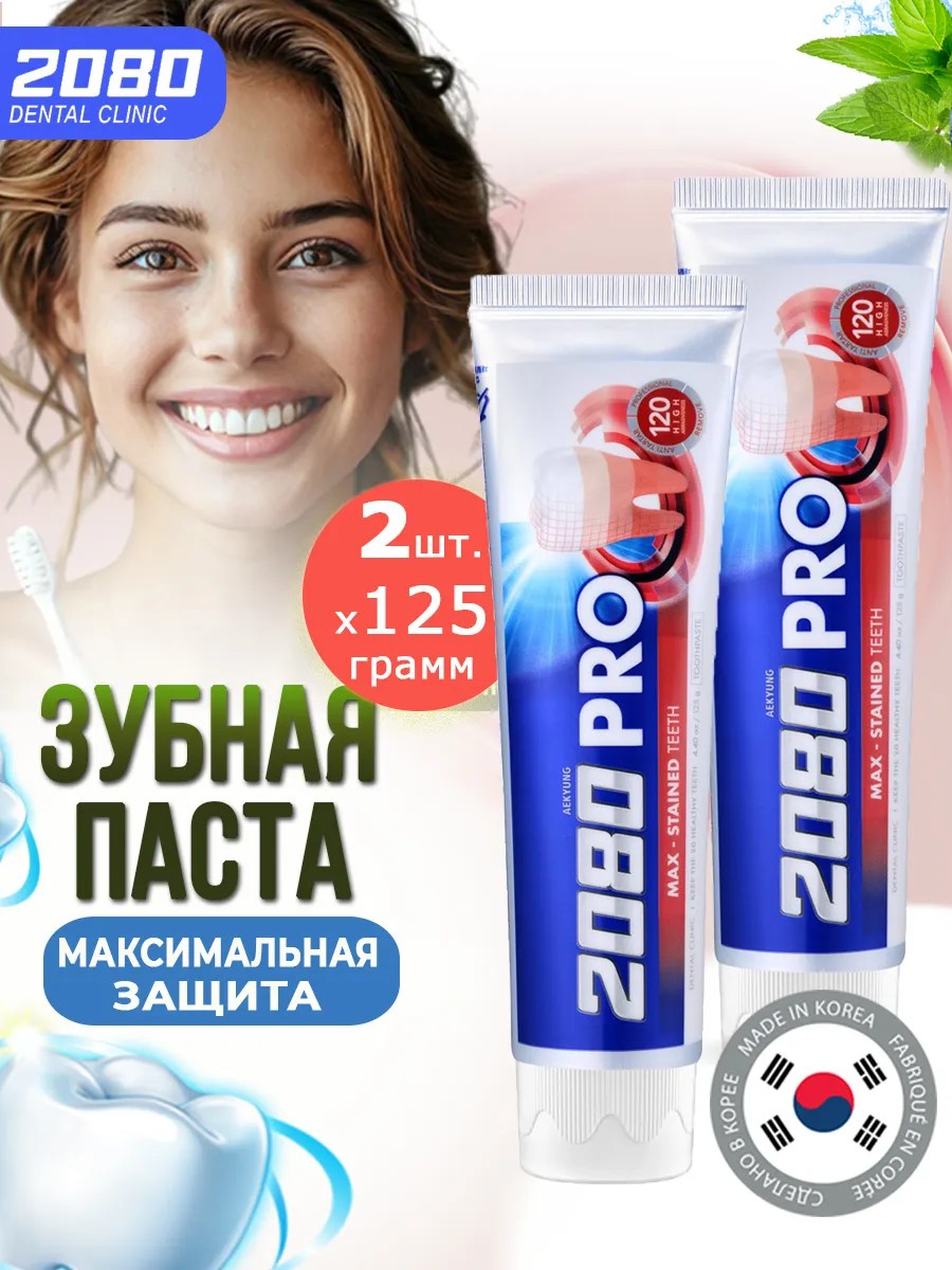 Set: Dental Clinic 2080 Pro Max Anti-Caries Toothpaste. Maximum protection for perfect oral hygiene. This highly abrasive gel toothpaste, RDA-120, provides comprehensive oral care. Without damaging tooth enamel, this Korean toothpaste gently cleans teeth from plaque, even when wearing braces, and prevents tartar buildup. It gently whitens and polishes tooth enamel. A complex of amino acids and vitamins relieves tooth and gum sensitivity, prevents periodontal disease, gingivitis, and bleeding. Fluoride strengthens teeth and protects against demineralization, prevents cavities and treats them at the white spot stage, and neutralizes bacteria that cause bad breath. This Korean toothpaste provides a feeling of comfort, freshens breath, and improves the aesthetics of your smile. The paste has a mild, refreshing taste. Fluoride content is 0.1%. Formula without hazardous ingredients, suitable for daily use