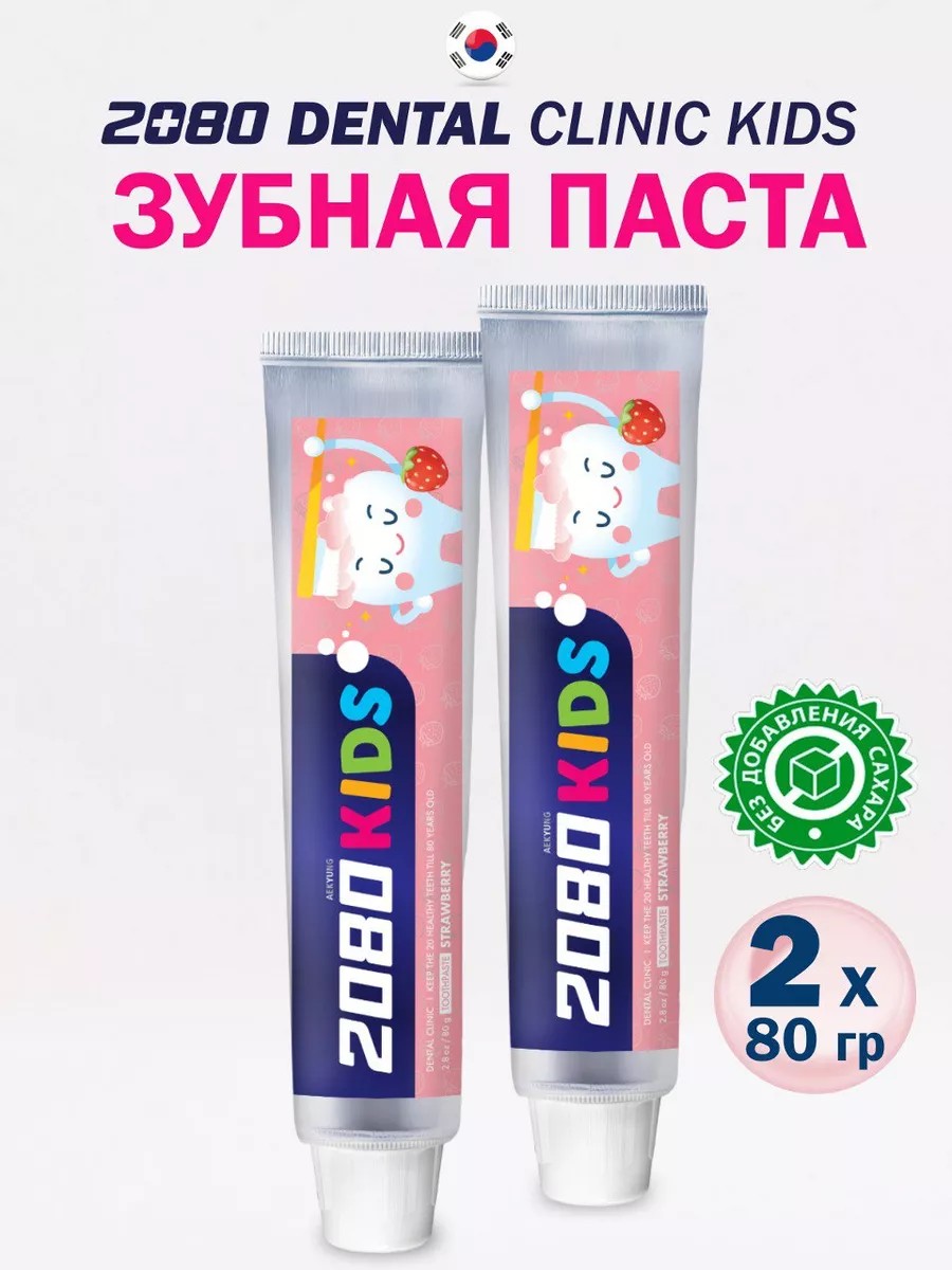 SET OF 2 x 80 ml. Dental Clinic 2080 Kids Strawberry Toothpaste for perfect oral hygiene. This Korean children's toothpaste is specially formulated for gentle and effective care of children's teeth. This children's toothpaste contains xylitol, which has antimicrobial and anti-inflammatory properties. The active ingredients gently remove plaque and prevent cavities and tartar. Fluoride and calcium strengthen tooth enamel, promoting the proper formation of baby teeth. This children's toothpaste contains Vitamin E, which promotes healthy gums. This children's toothpaste contains the finest known abrasive, which gently cleans teeth and gums without damaging tooth enamel. This children's toothpaste with fluoride has a light strawberry flavor and aroma. This toothpaste will be an excellent aid in developing healthy habits in your child. The formula is free of hazardous ingredients, parabens, and safe if accidentally swallowed. For children 2 years and older.
