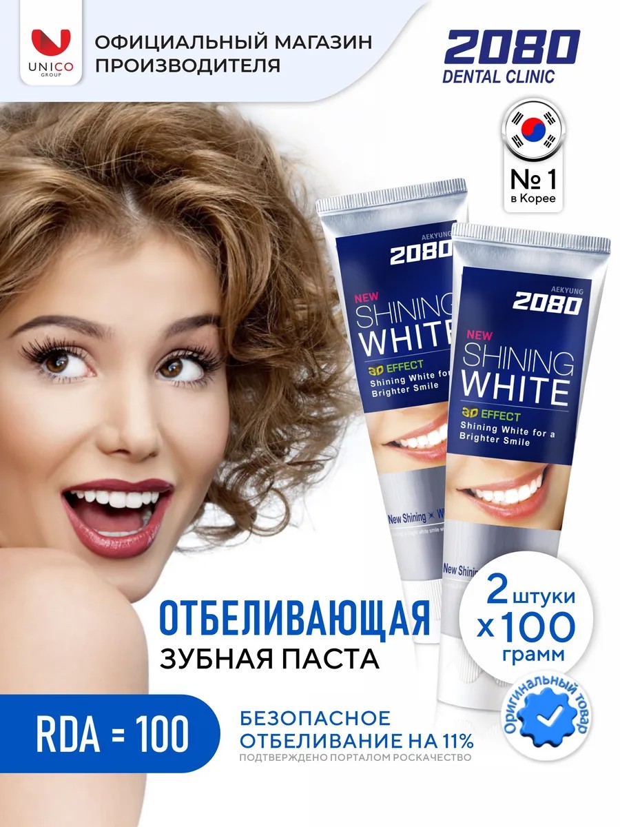 Воспользуйтесь уникальным предложением по выгодной цене Набор включает две пасты по 100 г, дарит вам ослепительно белую улыбку. Оцените корейское качесвто и приятный вкус зубной пасты Сияющая Белизна 2080.