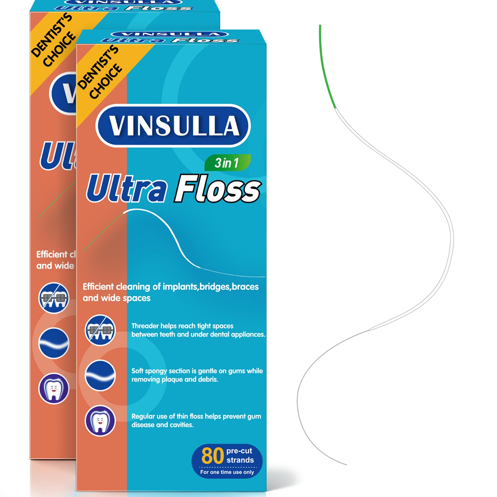 Convenient Pre-Cut Strands:Includes 80 pre-measured floss strands, saving you time and ensuring a consistent, hassle-free flossing experience every time. Ideal for daily oral care. Comfortable Flexible Design:The unique stiffened-end threader offers the perfect balance of stiffness and flexibility, making it easy to use for all types of dental work, from braces to wide gaps. Everyday Cleaning: Convenient and Effective Oral Care. Designed for daily use, this floss threader makes oral hygiene easier and more efficient. Whether you're managing braces, dental work, or just want a cleaner smile, our floss is perfect for daily dental care. It effortlessly glides between teeth to remove food particles and plaque, leaving your mouth feeling fresh and clean all day long. INNOVATIVE 3-SECTION DESIGN: Each strand features three distinct zones for maximum efficiency: 1) A stiffened-end threader for easy insertion under wires 2) A thick spongy mesh that expands to sweep wide gaps clean and 3) A regular smooth floss section to remove stubborn plaque along the tight gumline. No separate needle threaders are required. Ultimate Floss: Ideal for Braces, Bridges, and Implants. Experience a superior clean with our specially designed orthodontic floss. Ideal for cleaning around braces, bridges, and implants, this floss reaches tight spaces and wide gaps, ensuring a deep clean every time. Say goodbye to plaque buildup and hello to fresh, healthy teeth!.