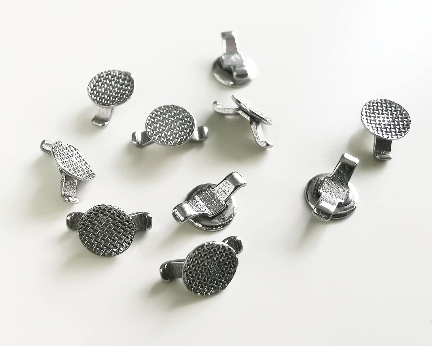 Round-shaped mesh base for excellent bonding strength, increase the bonding strength obviously. Made of high quality BIO stainless steel, Extra polishing shine. 30 Pcs Metal Lingual Buttons.