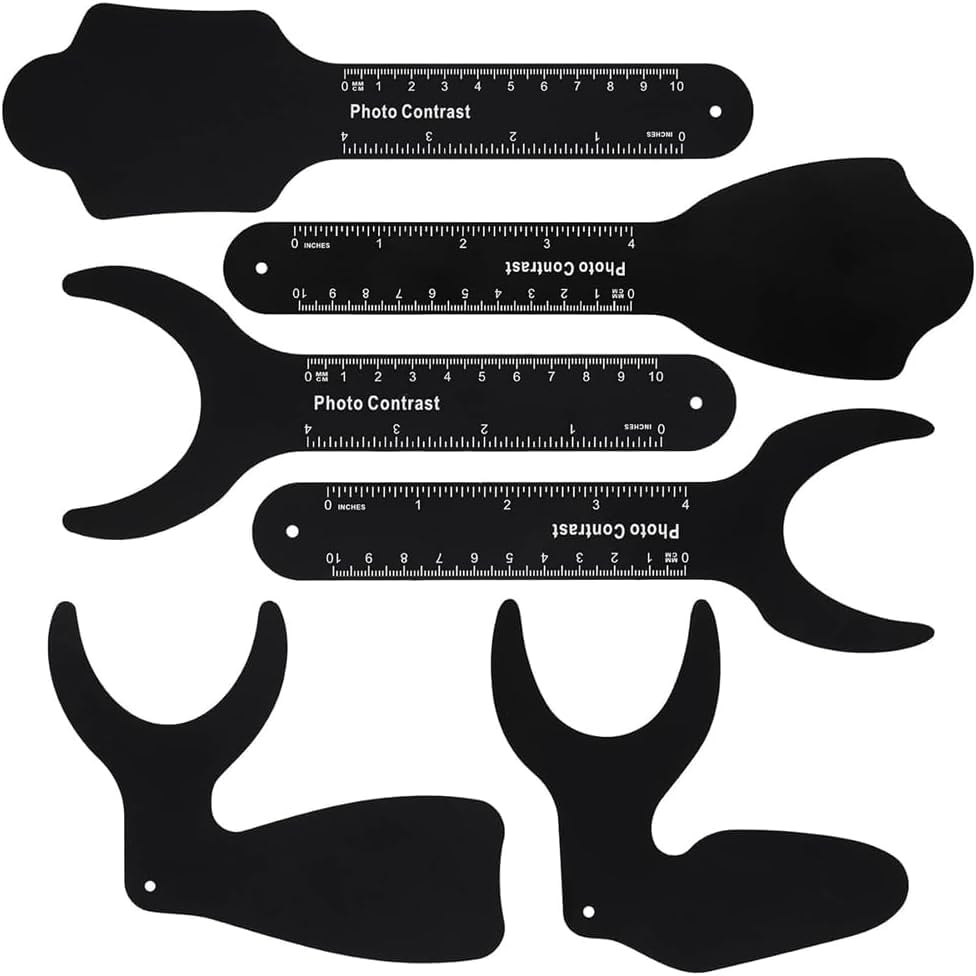 PRACTICAL SIZE: Compact and lightweight boards with convenient measurement scales for easy handling during dental procedures. DURABLE CONSTRUCTION: Made with high-quality black material that provides optimal contrast for dental imaging. VERSATILE DESIGN: Multiple shaped boards including palatal and standard formats for comprehensive dental photography angles. MEASUREMENT FEATURE: Integrated scale markings up to 10 inches and 4 inches for precise dental measurements and documentation. PROFESSIONAL SET: Complete 6-piece dental photography contrast board set designed for intraoral photography and documentation.