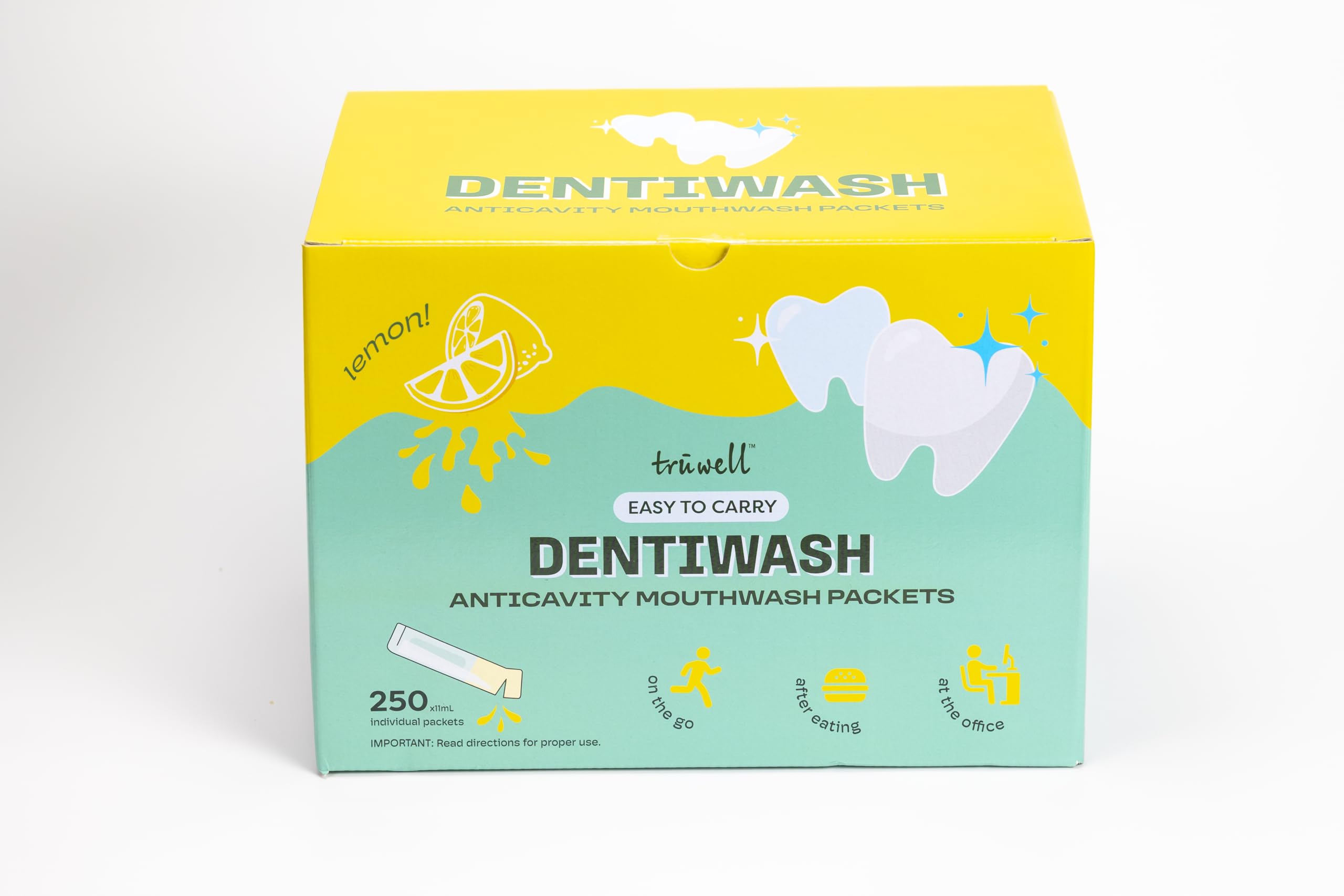 HEALTHY TEETH - Dentiwash prevents cavity, gingivitis, periodontitis, bad breath, and dry mouth. Dentiwash's special formula absorbs and removes proteins that cause bad breath. EASY TO CARRY - Small individual packets that can fit anywhere including your pockets and bags. Perfect for traveling, camping, hiking, business trips and its perfect for airplane traveling with TSA-approved small packets. ZERO ALCOHOL MOUTHWASH - Natural Ingredients only. Dentiwash uses no alcohol, no surfactants, no preservatives, and no artificial dyes. Very soft, gentle on your mouth and does not cause oral irritation. SPECIAL PATENT FORMULA MOUTHWASH - Dentiwash uses a special formula to extract oral protein waste from your mouth, which prevents bad breath, and keeps your mouth clean. 250 MOUTHWASH USES, INDIVIDUALLY PACKAGED - Dentiwash mouthwash has a strip design, each with 11ml content.